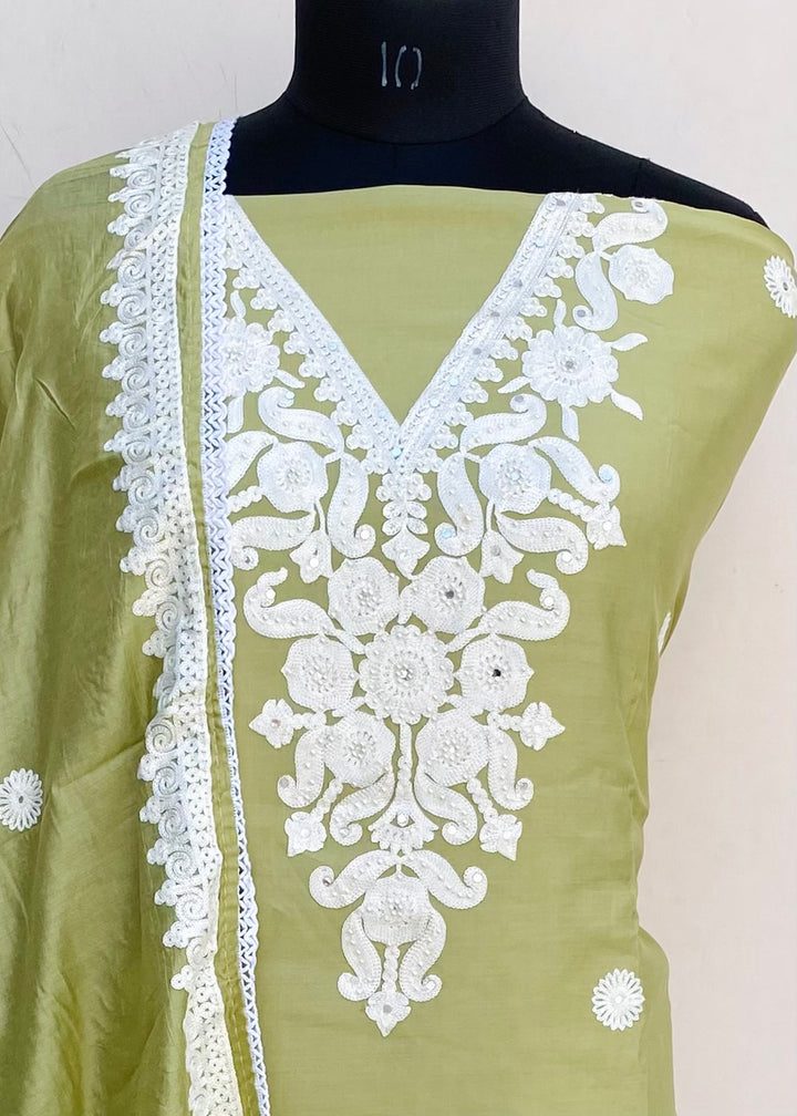 Designer Embroidered Suit Length 3 Piece Pista Green Muslin Cotton With Pearl Work With Embroidered Mal Chanderi Dupatta & Same Colour Santoon Bottom
