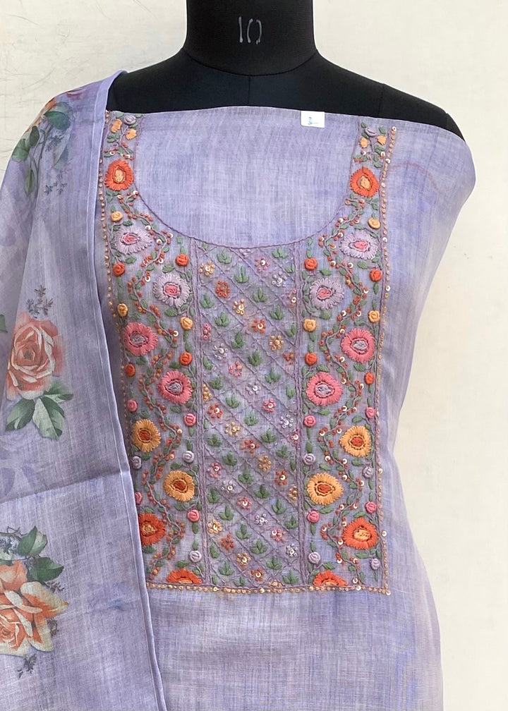 Designer Embroidered Suit Length 3 Piece Purple Linen With Sequence Work With Printed Linen Dupatta & Same Colour Cotton Bottom