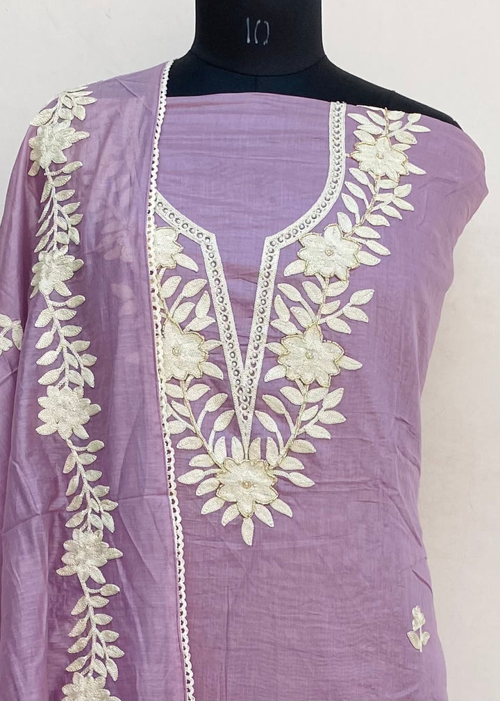 Designer Embroidered Suit Length 3 Piece Purple Mal Chanderi With Pearl & Cutdana Work With Embroidered Mal Chanderi Dupatta & Same Colour Santoon Bottom