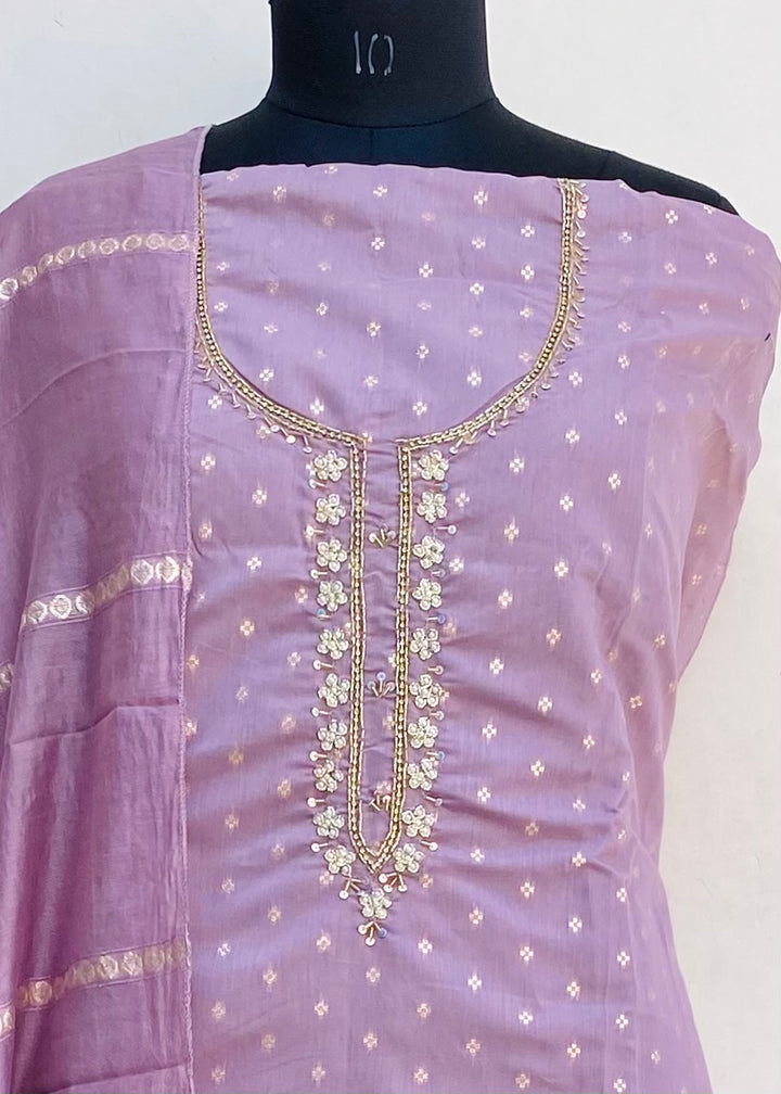 Designer Embroidered Suit Length 3 Piece Purple Mal Chanderi With Pearl, Sequence & Cutdana Work With Embroidered Mal Chanderi Dupatta & Same Colour Santoon Bottom
