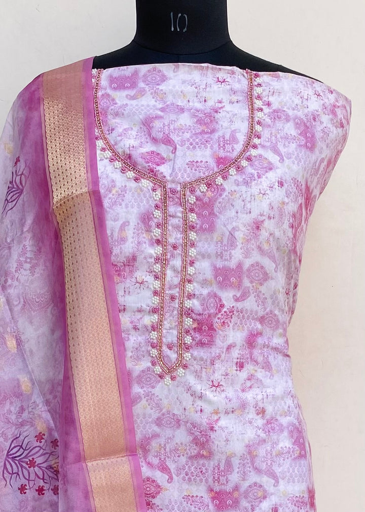 Designer Embroidered Suit Length 3 Piece Purple Mal Chanderi With Pearl Work With Printed Mal Chanderi Dupatta & Same Colour Santoon Bottom