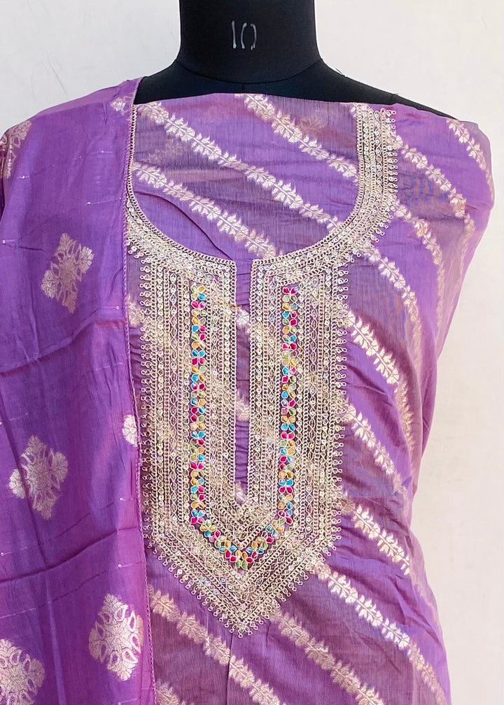 Designer Embroidered Suit Length 3 Piece Purple Mal Chanderi With Sequence Work With Embroidered Mal Chanderi Dupatta & Same Colour Santoon Bottom
