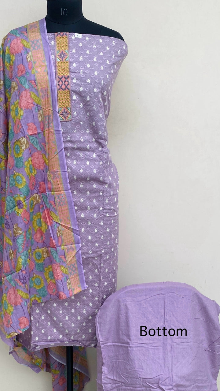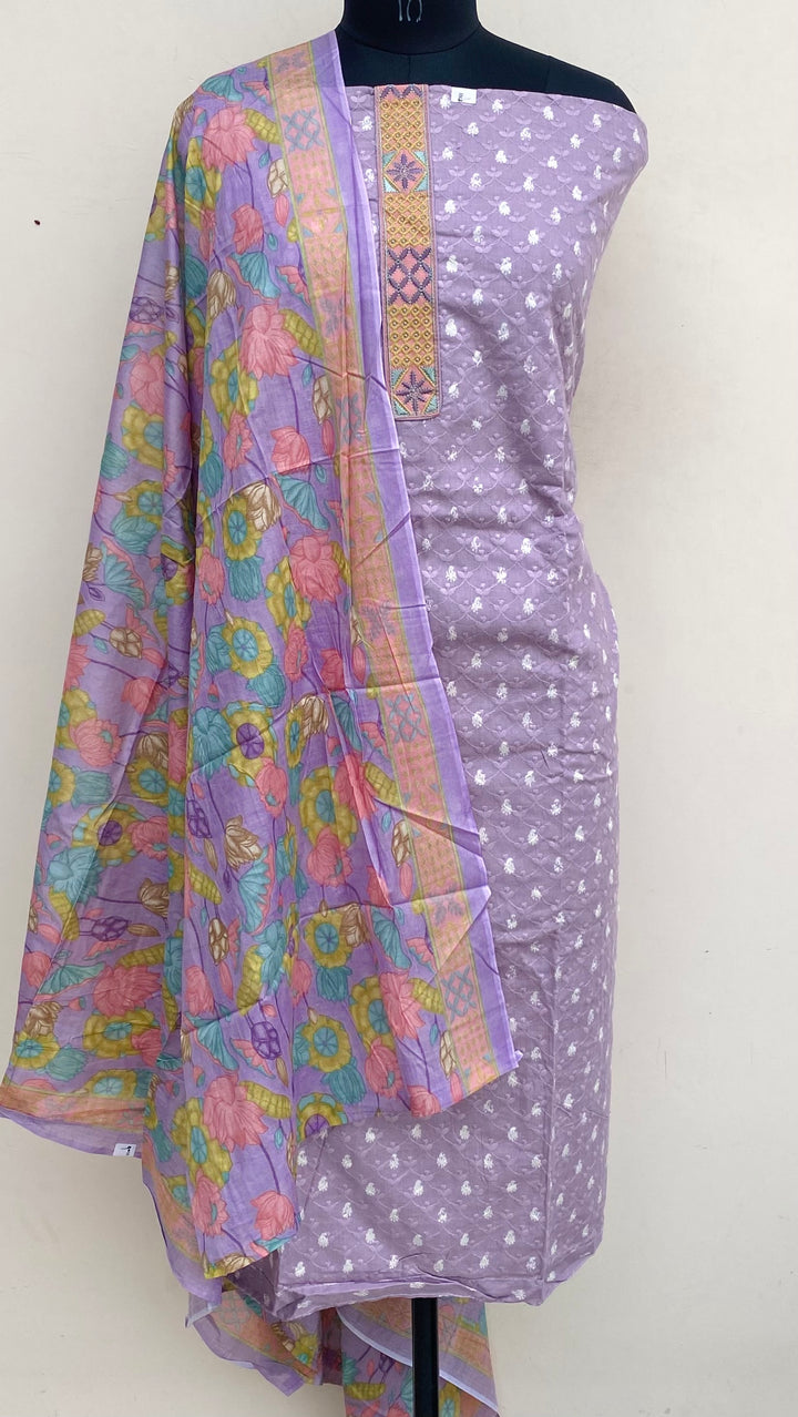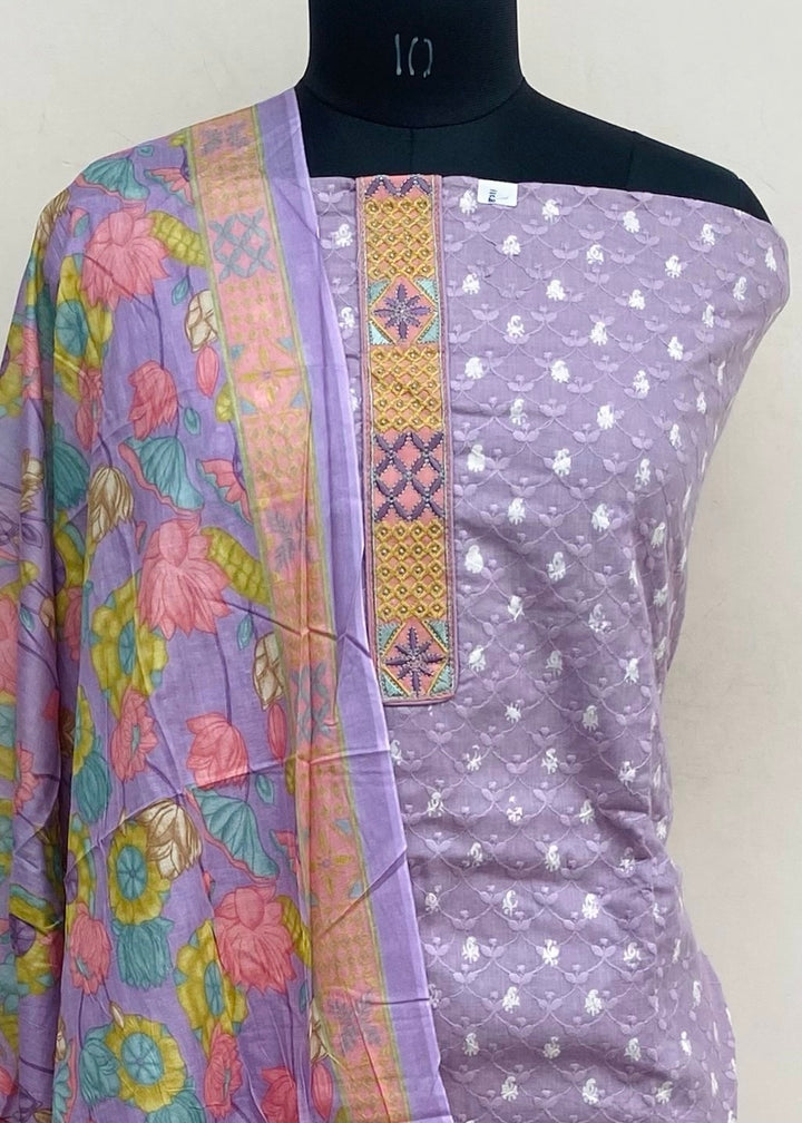 Designer Embroidered Suit Length 3 Piece Purple Mal Cotton With Printed Mal Cotton Dupatta & Same Colour Cotton Bottom