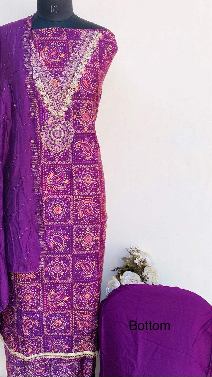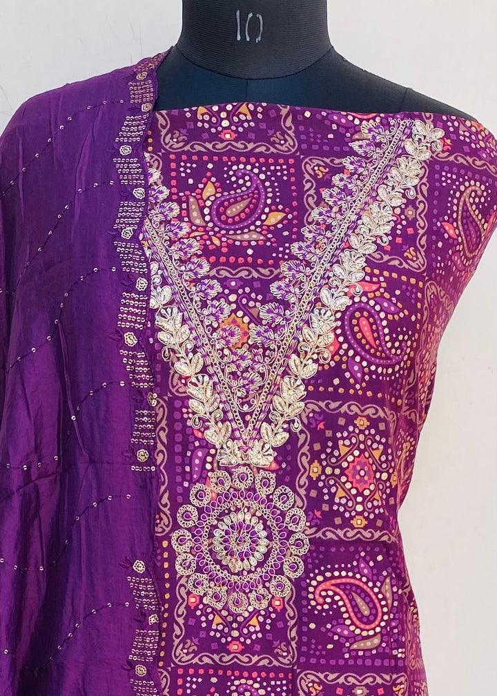 Designer Embroidered Suit Length 3 Piece Purple Muslin Cotton With Sequence Work With Embroidered Mal Chanderi Dupatta & Same Colour Cotton Bottom