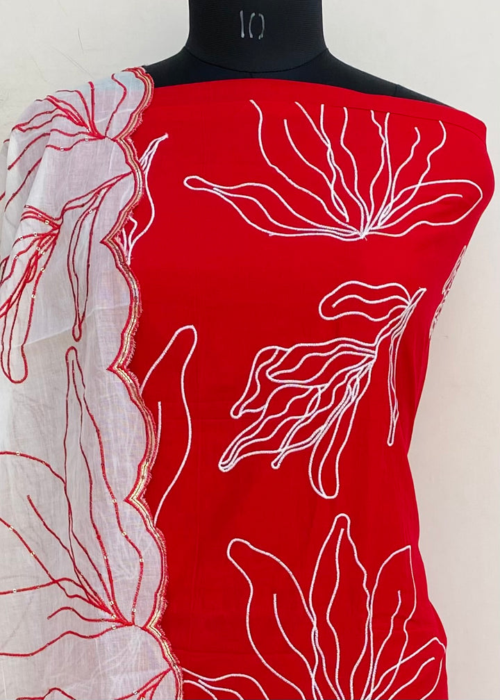 Designer Embroidered Suit Length 3 Piece Red Mal Cotton