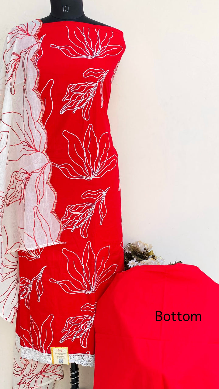 Designer Embroidered Suit Length 3 Piece Red Mal Cotton With Embroidered Mal Cotton Dupatta & Same Colour Cotton Bottom