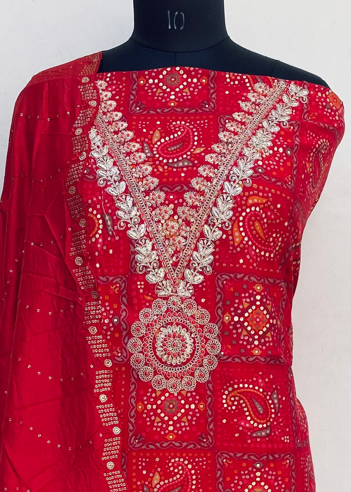 Designer Embroidered Suit Length 3 Piece Red Muslin Cotton With Sequence Work With Embroidered Mal Chanderi Dupatta & Same Colour Cotton Bottom