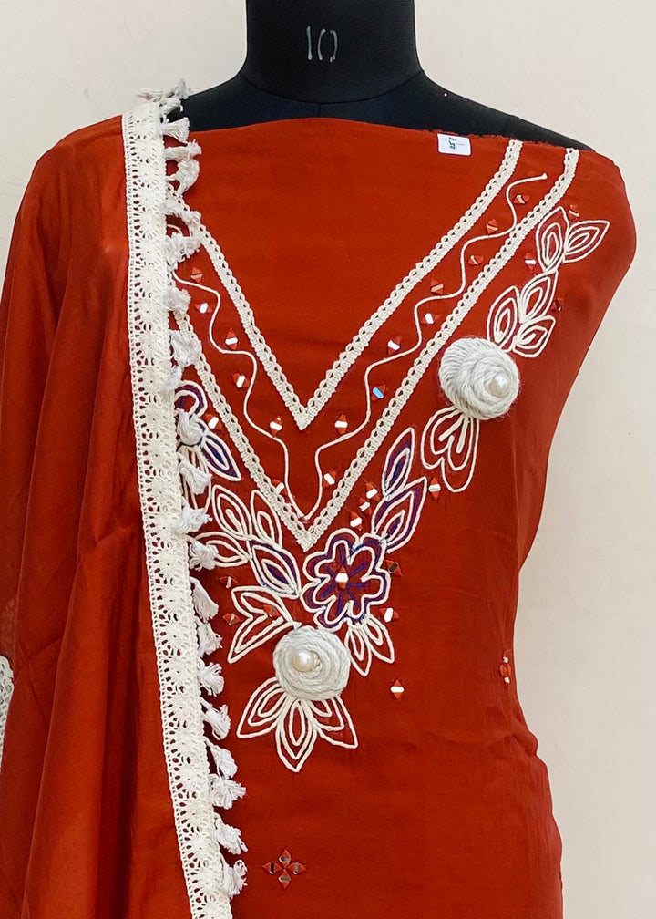 Designer Embroidered Suit Length 3 Piece Rust Mal Chanderi With Mirror Work With Embroidered Mal Chanderi Dupatta & Same Colour Cotton Bottom