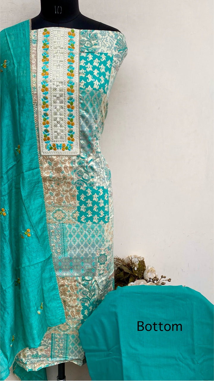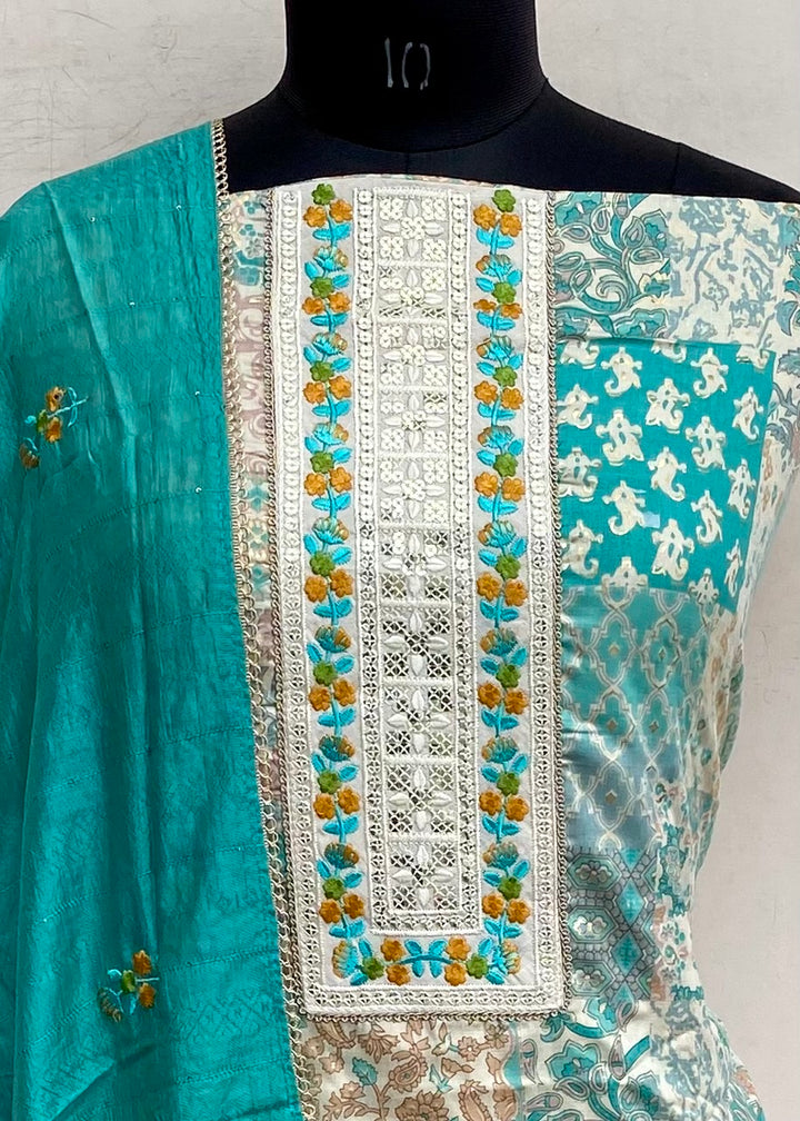 Designer Embroidered Suit Length 3 Piece Sea Green Muslin Cotton With Sequence Work With Embroidered Muslin Dupatta & Same Colour Cotton Bottom