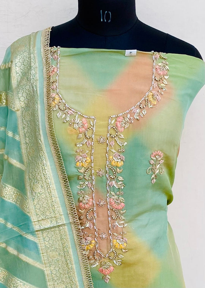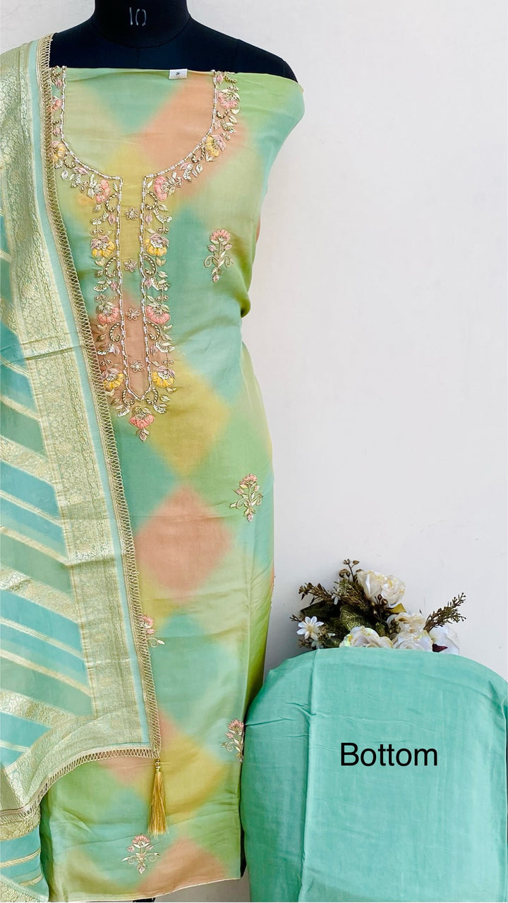 Designer Embroidered Suit Length 3 Piece Teal Green Mal Chanderi With Pearl & Sequence Work