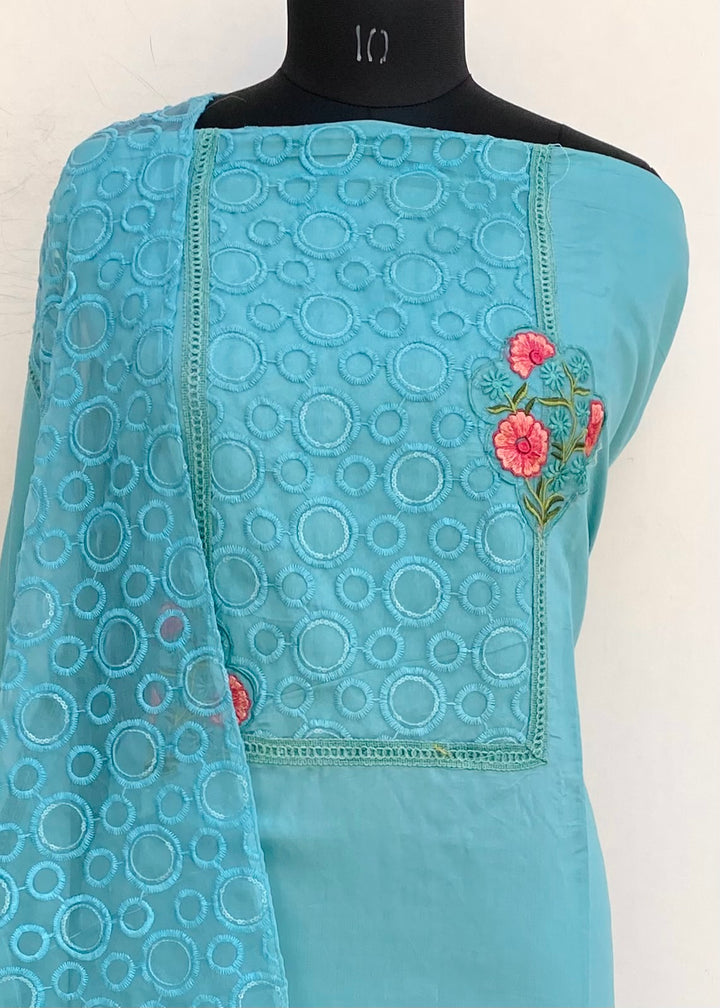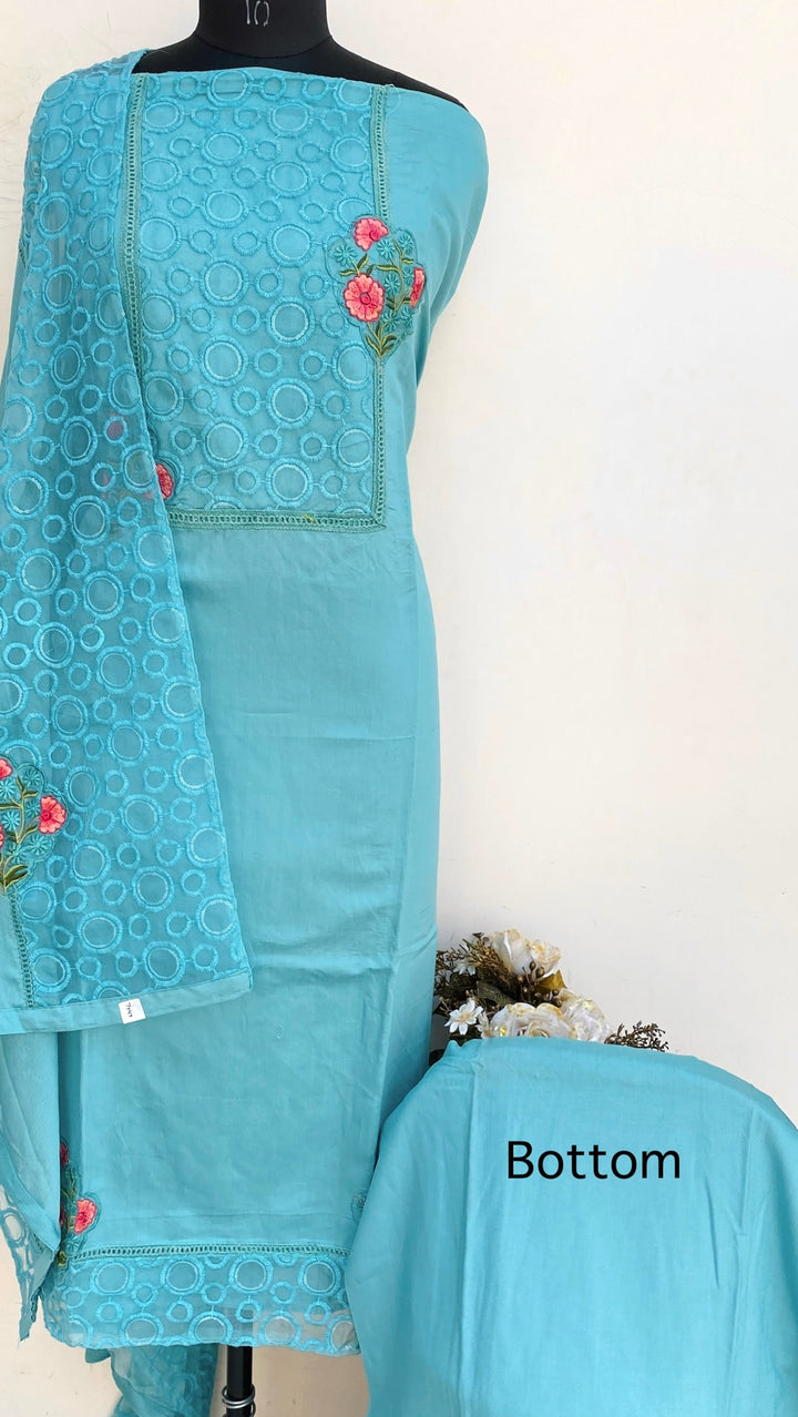 Designer Embroidered Suit Length 3 Piece Turquoise Green Mal Cotton With Embroidered Pure Chiffon Dupatta & Same Colour Cotton Bottom