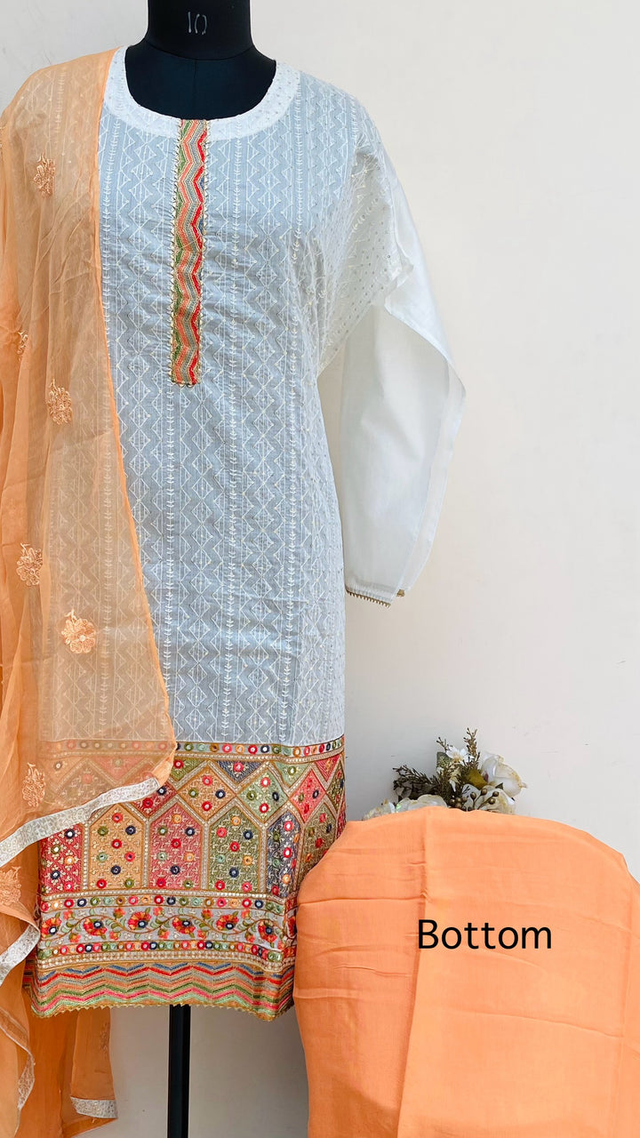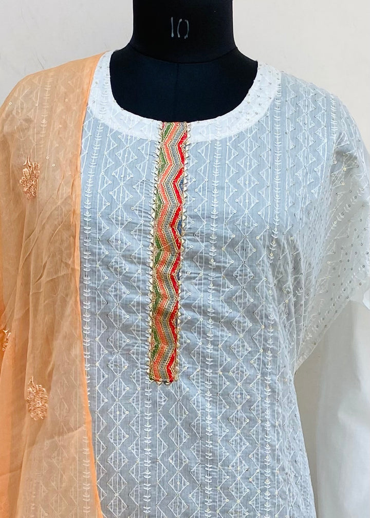 Designer Embroidered Suit Length 3 Piece White Mal Chanderi With Sequence Work With Embroidered Pure Chiffon Dupatta & Peach Colour Cotton Bottom