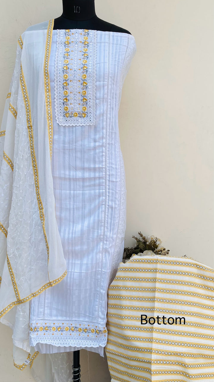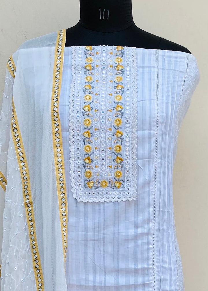 Designer Embroidered Suit Length 3 Piece White Mal Cotton With Embroidered Pure Chiffon Dupatta & Printed Cream Colour Cotton Bottom