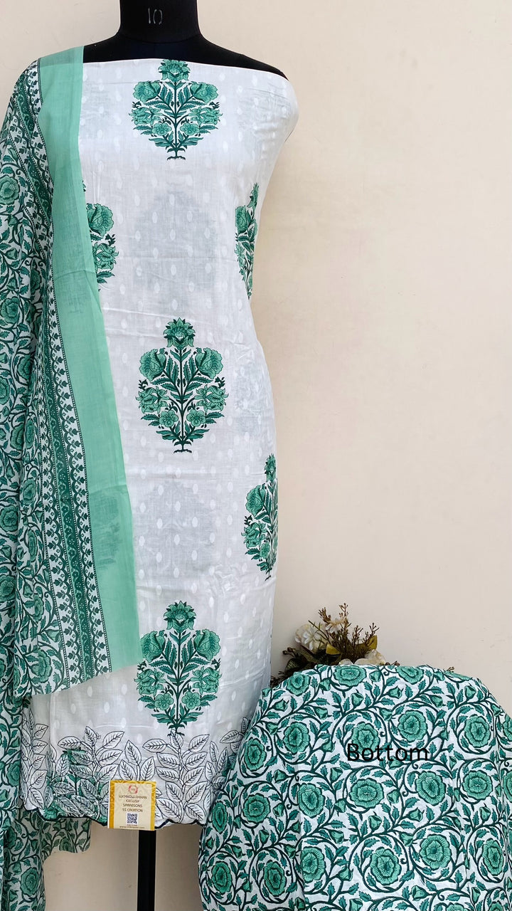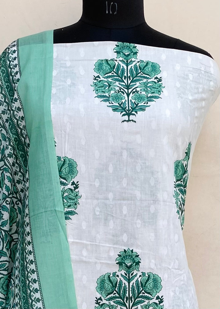 Designer Embroidered Suit Length 3 Piece White Mal Cotton With Printed Mal Cotton Dupatta & Printed Same Colour Cotton Bottom