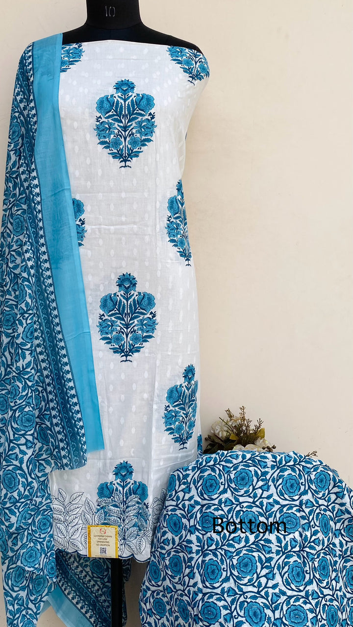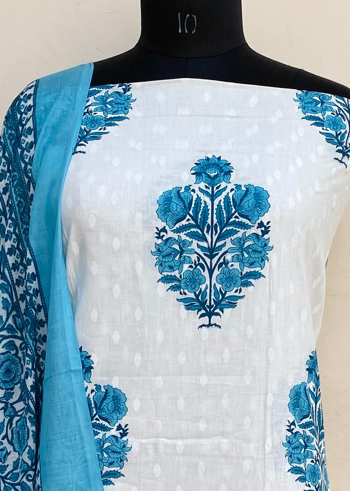 Designer Embroidered Suit Length 3 Piece White Mal Cotton With Printed Mal Cotton Dupatta & Printed Same Colour Cotton Bottom