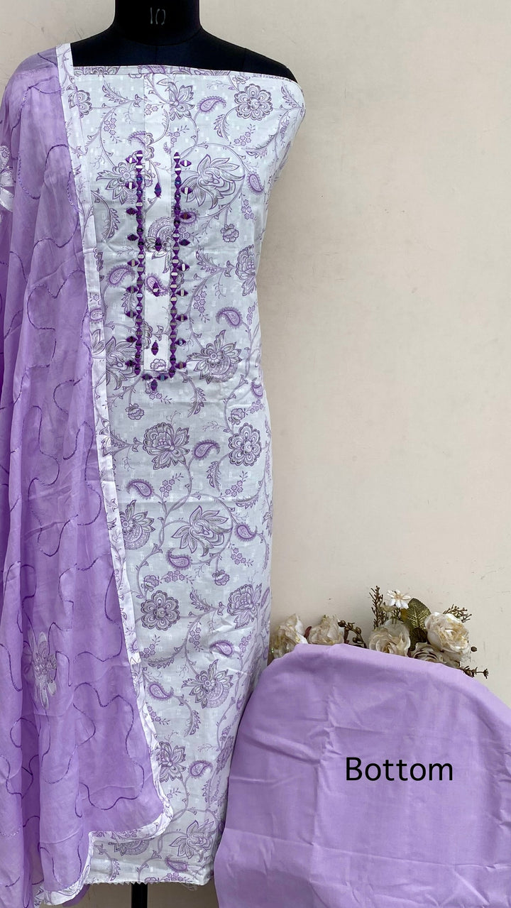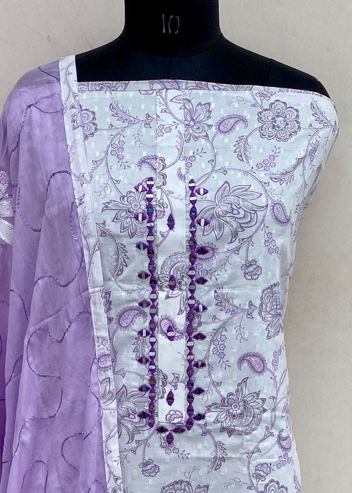 Designer Embroidered Suit Length 3 Piece White Mal Cotton With Mirror Work With Embroidered Mal Cotton Dupatta & Purple Colour Cotton Bottom