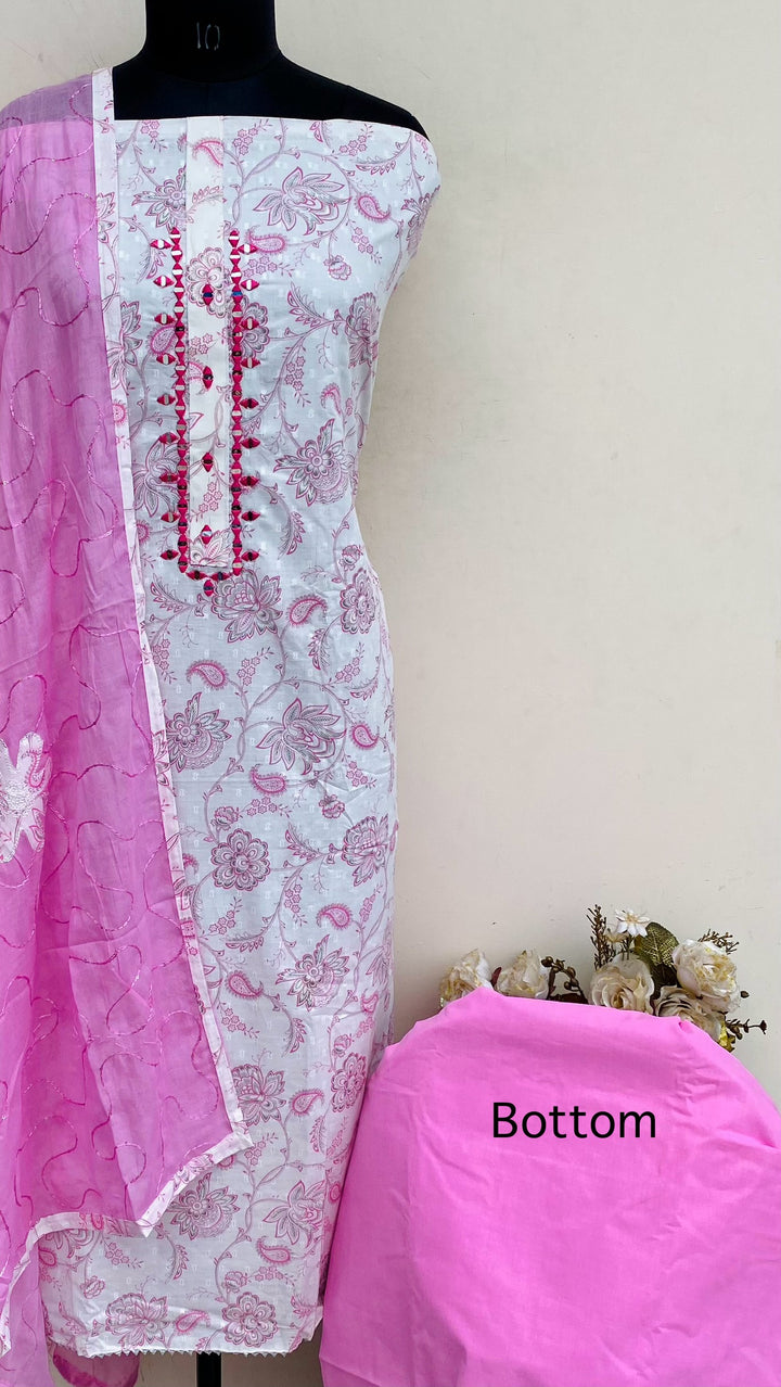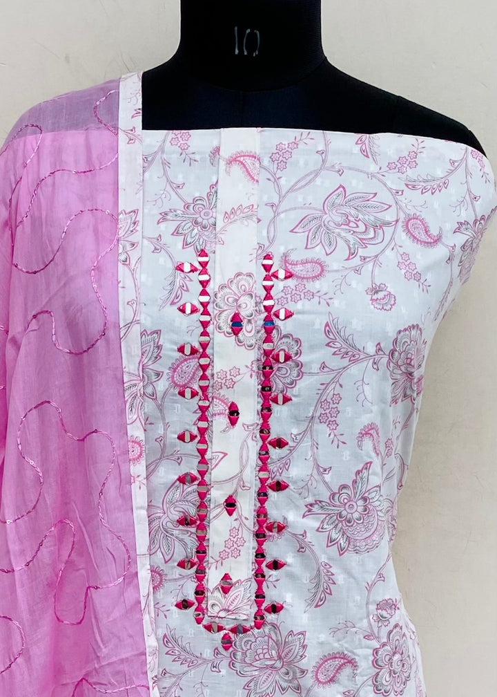 Designer Embroidered Suit Length 3 Piece White Mal Cotton With Mirror Work With Embroidered Mal Cotton Dupatta & Pink Colour Cotton Bottom