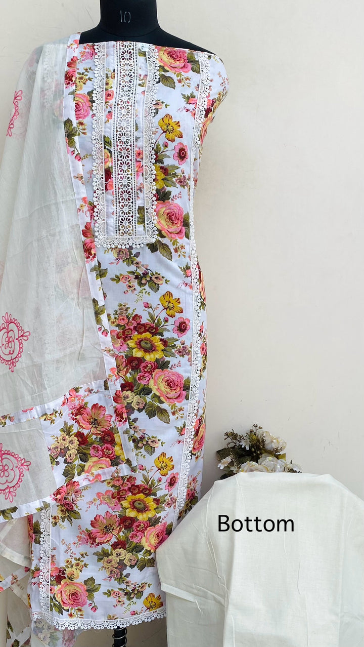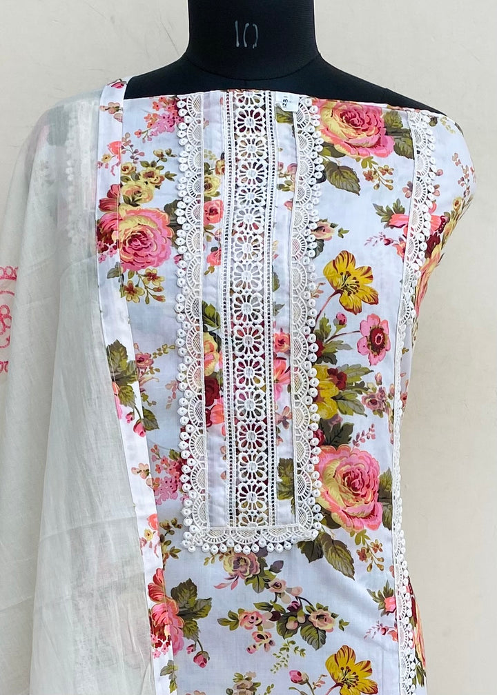 Designer Embroidered Suit Length 3 Piece White Muslin Cotton With Embroidered Mal Cotton Dupatta & Cream Colour Cotton Bottom