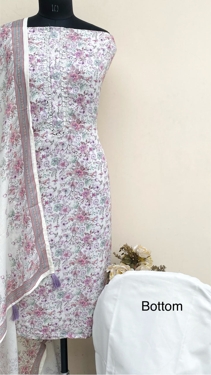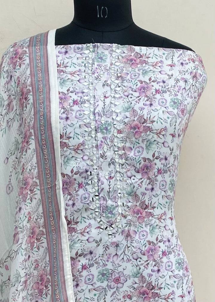 Designer Embroidered Suit Length 3 Piece White Muslin Cotton With Mirror Work With Printed Mulmul Dupatta & Same Colour Cotton Bottom