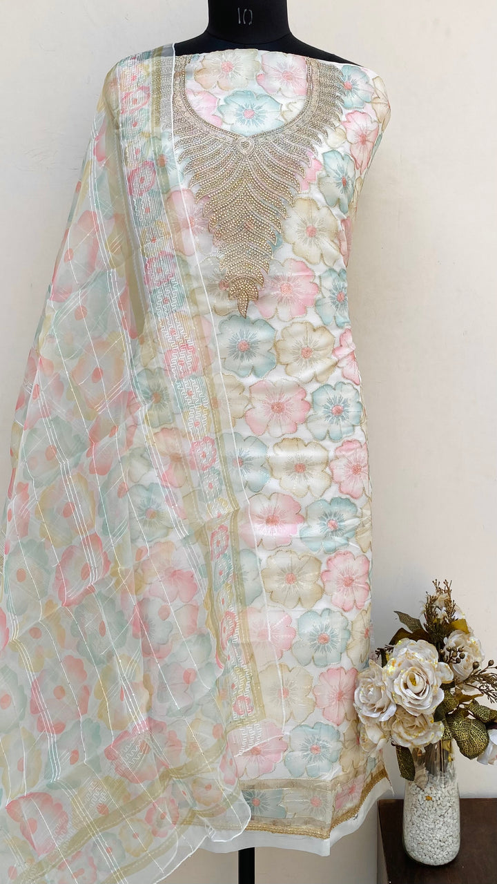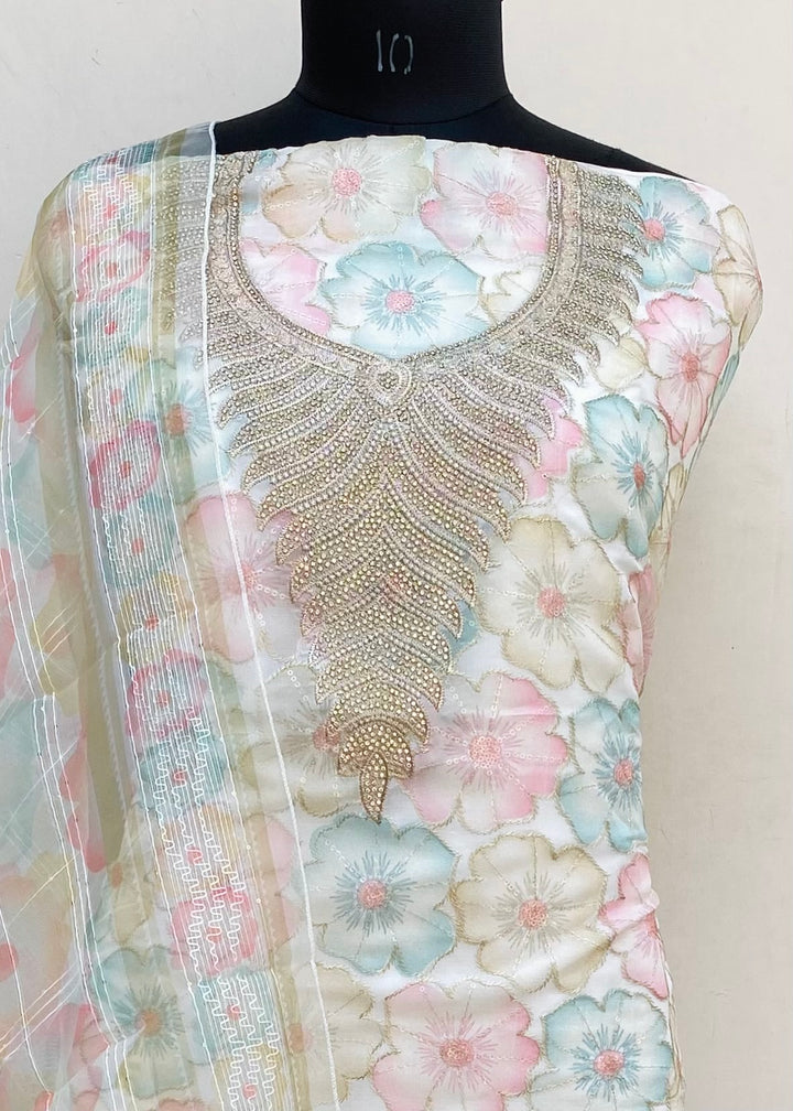 Designer Embroidered Suit Length 3 Piece White Organza With Sequence & Stone Work