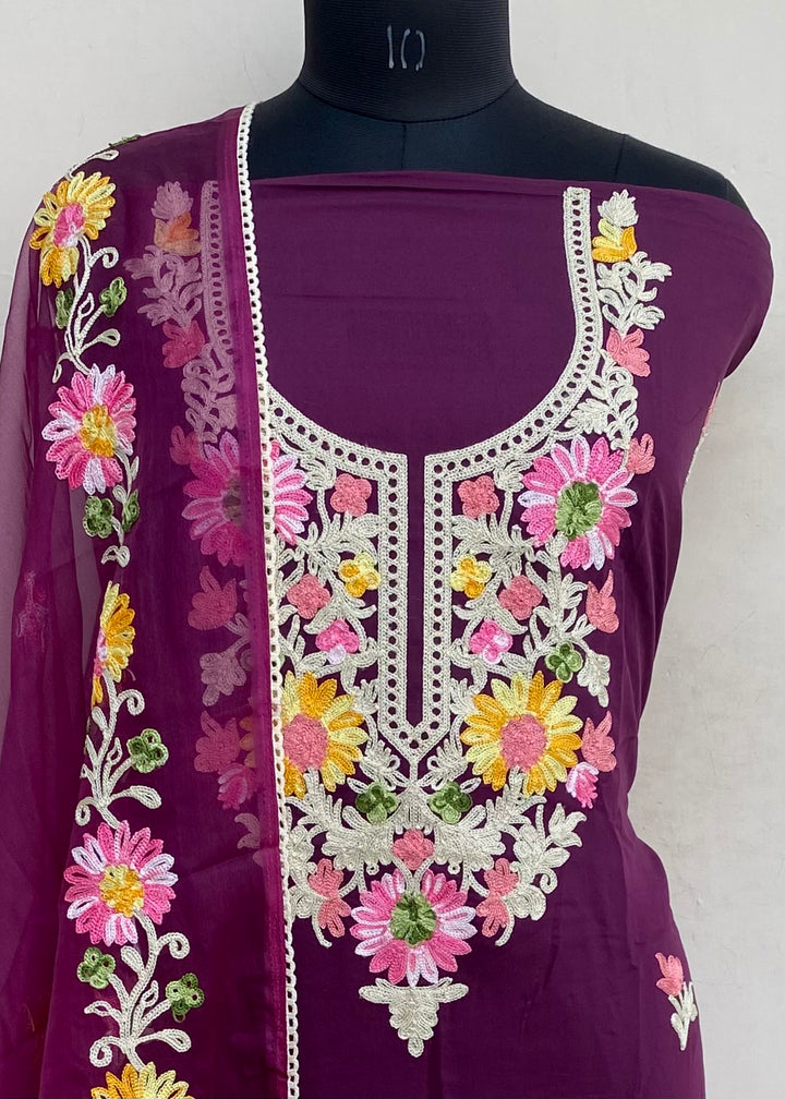 Designer Embroidered Suit Length 3 Piece Wine Mal Chanderi With Embroidered Organza Dupatta & Same Colour Santoon Bottom