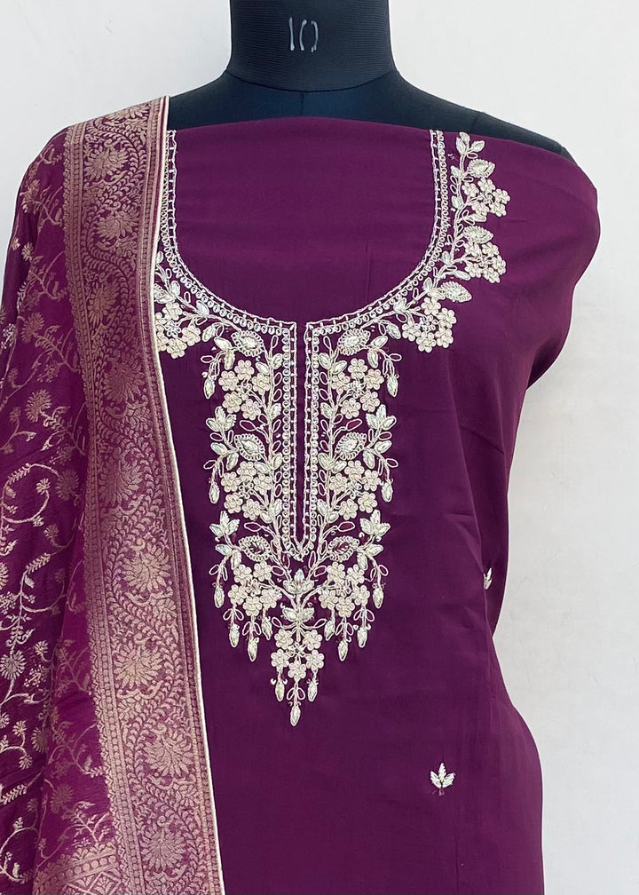 Designer Embroidered Suit Length 3 Piece Wine Mal Chanderi With Sequence Work