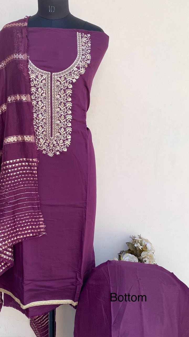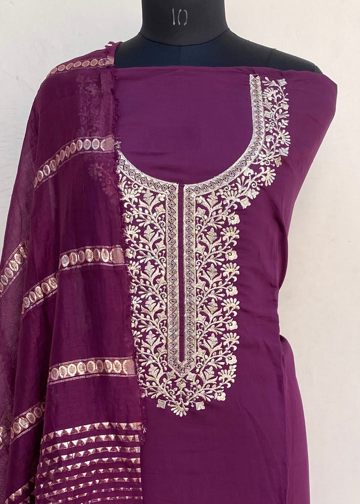 Designer Embroidered Suit Length 3 Piece Wine Muslin Cotton With Embroidered Mal Chanderi Dupatta & Same Colour Santoon Bottom