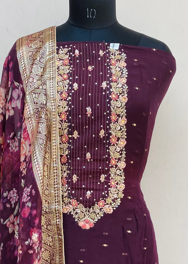Designer Embroidered Suit Length 3 Piece Wine Organza With Pearl ,Sequence & Stone Work With Embroidered Organza Dupatta & Same Colour Cotton Bottom