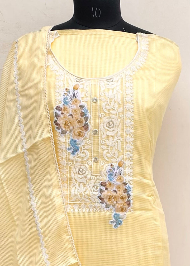 Designer Embroidered Suit Length 3 Piece Yellow Kota With Embroidered Kota Dupatta & Same Colour Cotton Bottom