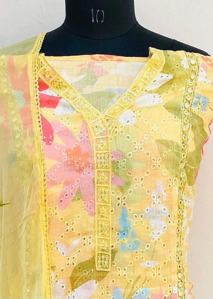 Designer Embroidered Suit Length 3 Piece Yellow Linen With Sequence Work With Printed Pure Chiffon Dupatta & Same Colour Cotton Bottom