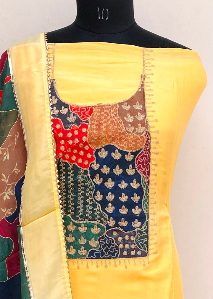 Designer Embroidered Suit Length 3 Piece Yellow Mal Chanderi