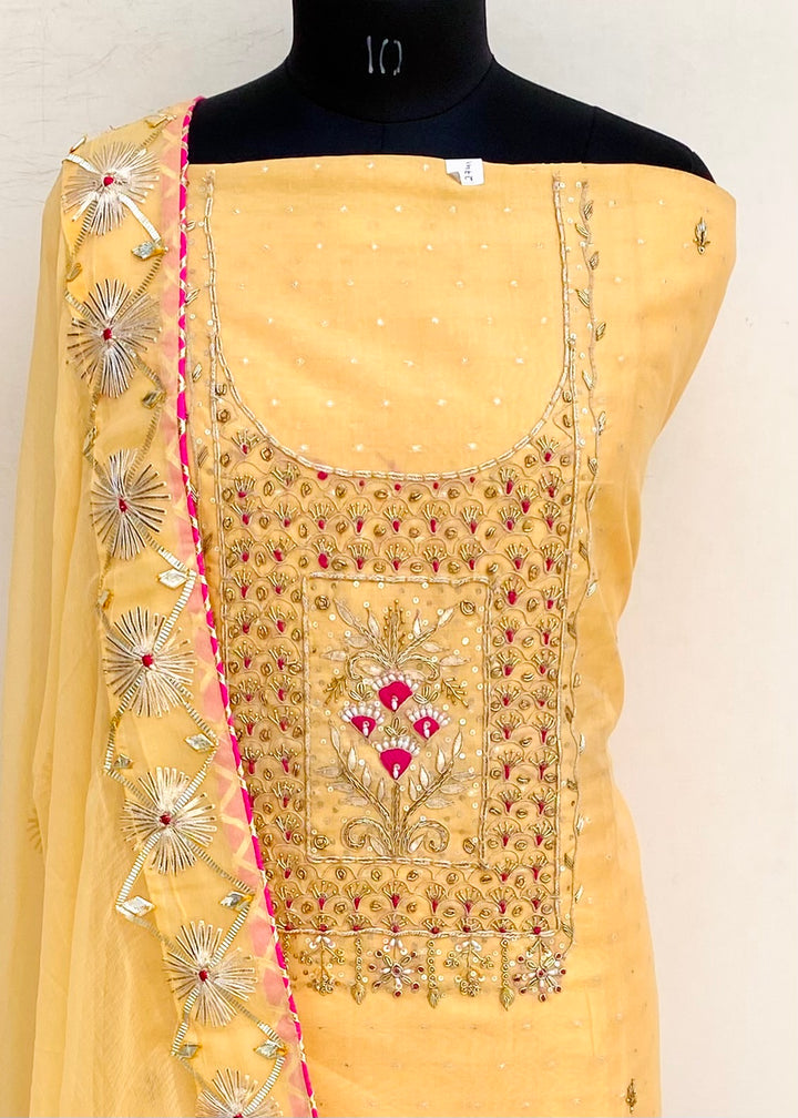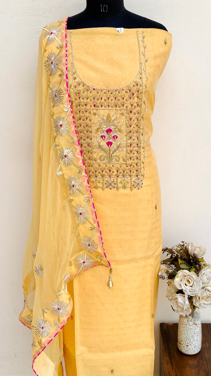 Designer Embroidered Suit Length 3 Piece Yellow Mal Chanderi With Pearl, Cutdana & Sequence Work With Embroidered Pure Chiffon Dupatta & Same Colour Cotton Bottom