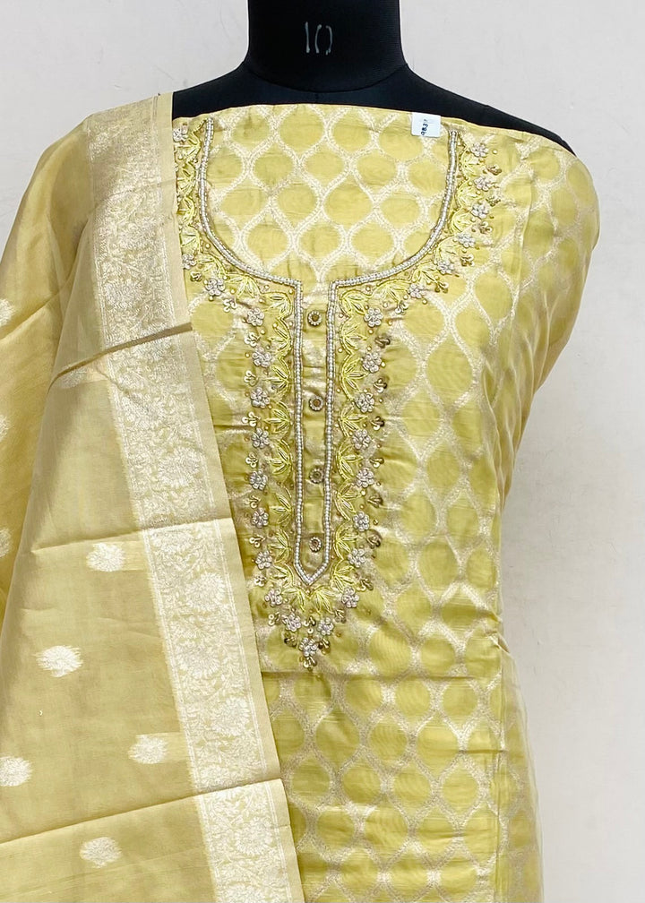Designer Embroidered Suit Length 3 Piece Yellow Mal Chanderi With Pearl, Sequence & Cutdana Work