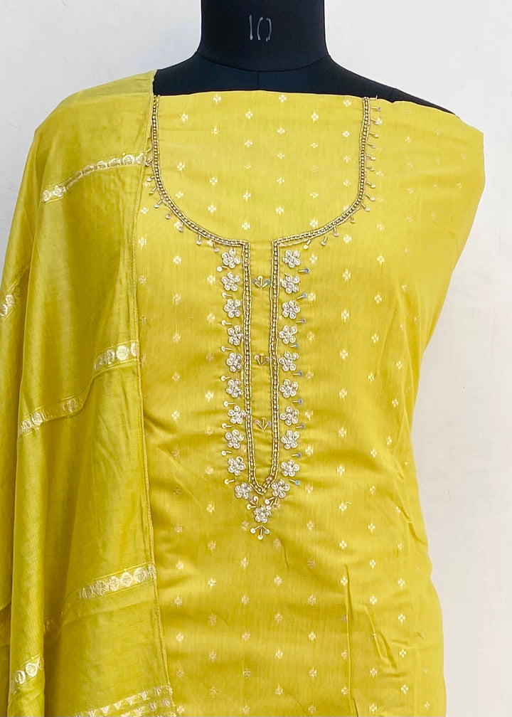 Designer Embroidered Suit Length 3 Piece Yellow Mal Chanderi With Pearl, Sequence & Cutdana Work