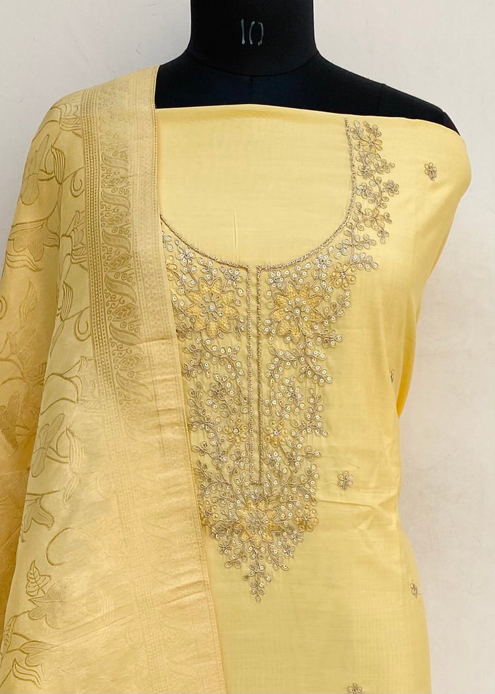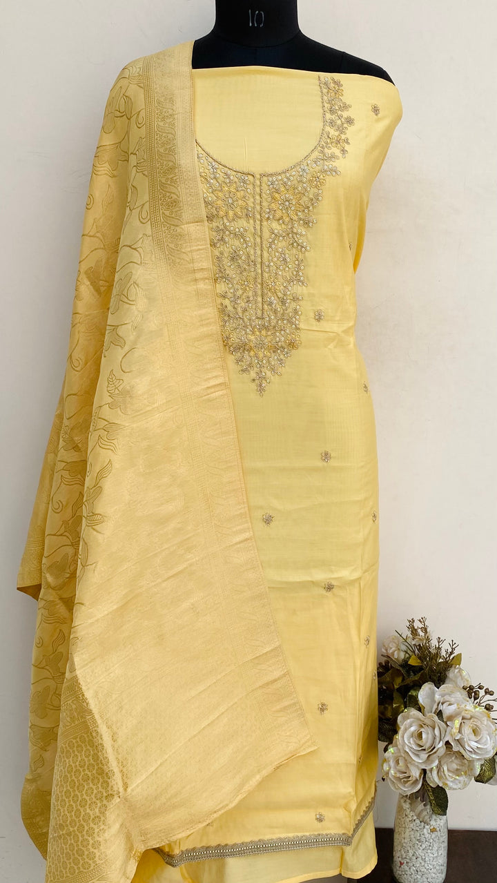 Designer Embroidered Suit Length 3 Piece Yellow Mal Chanderi With Sequence Work