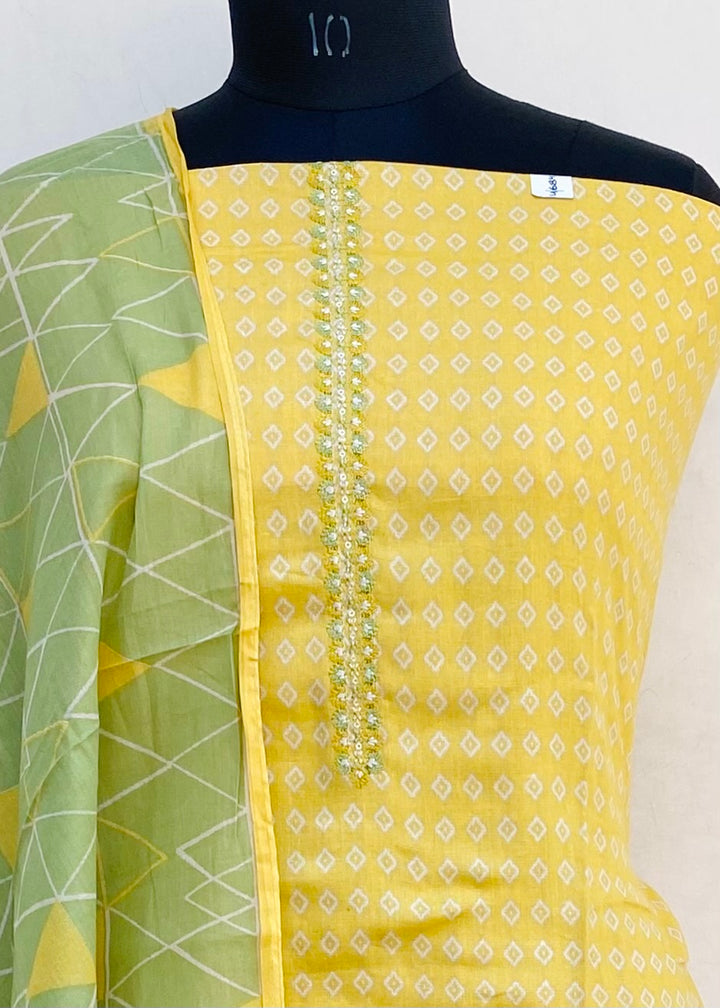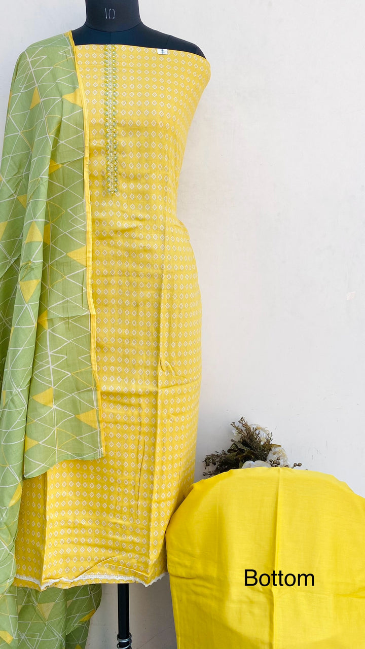Designer Embroidered Suit Length 3 Piece Yellow Mal Cotton With Printed Mal Cotton Dupatta & Same Colour Cotton Bottom