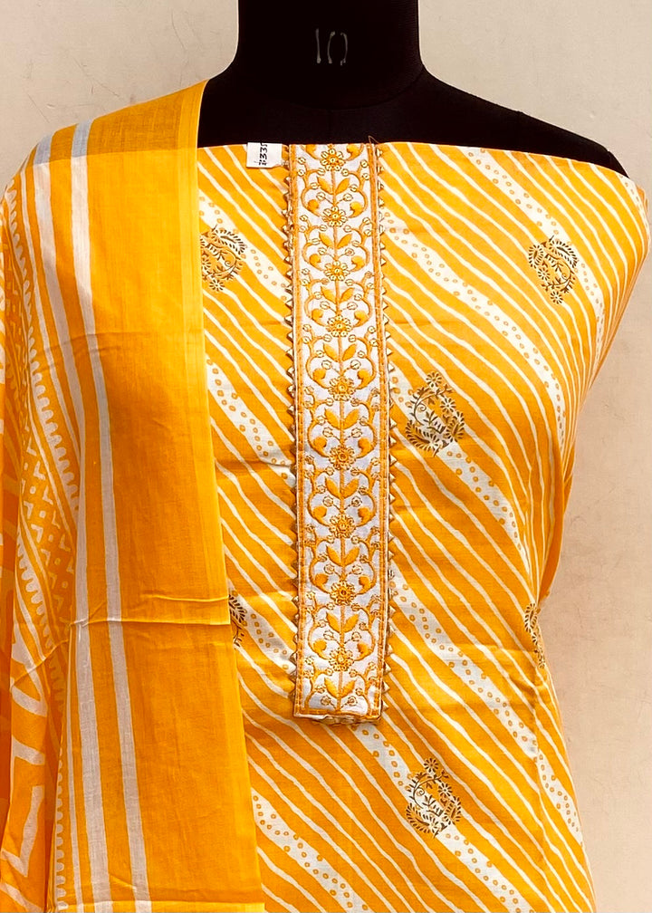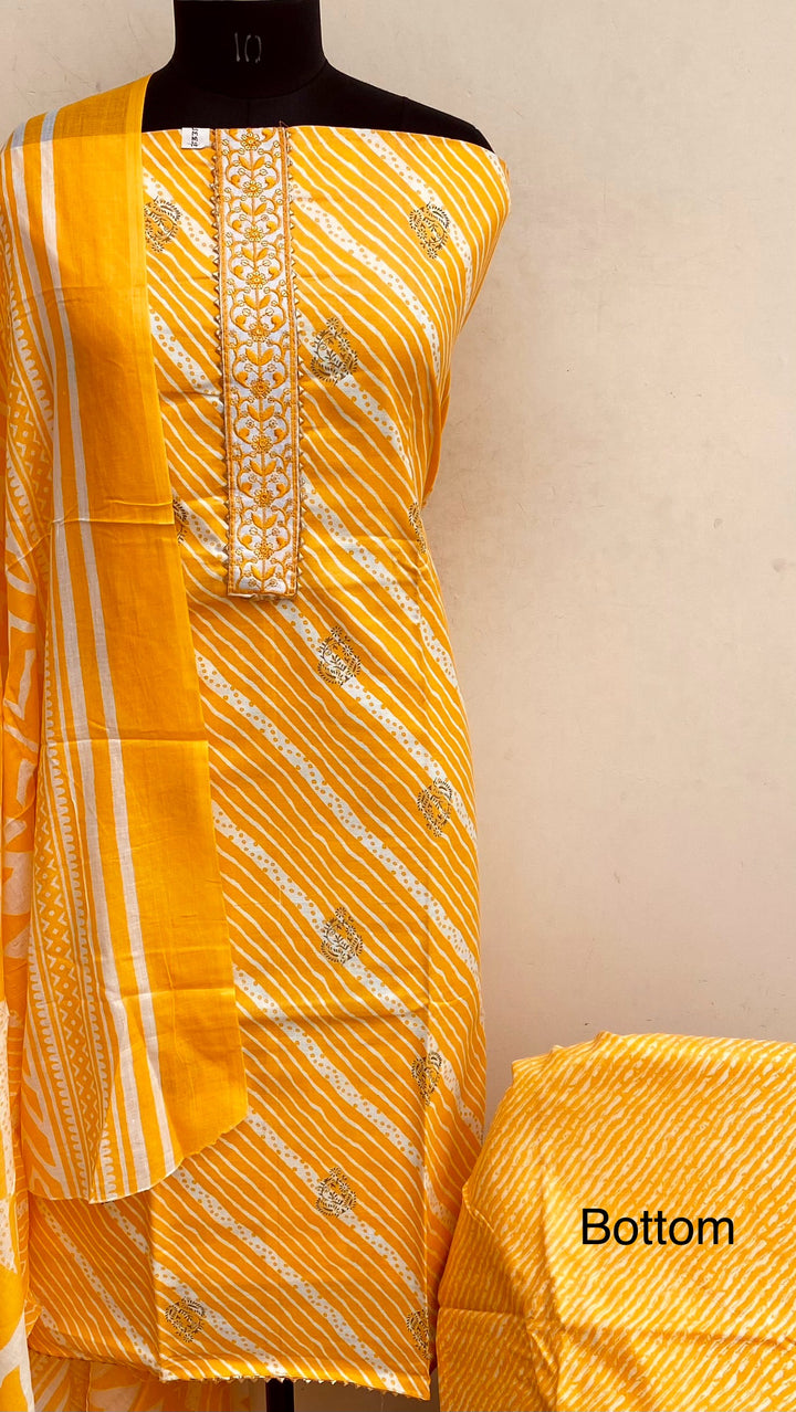 Designer Embroidered Suit Length 3 Piece Yellow Mal Cotton With Sequence Work With Printed Mal Cotton Dupatta & Printed Same Colour Cotton Bottom