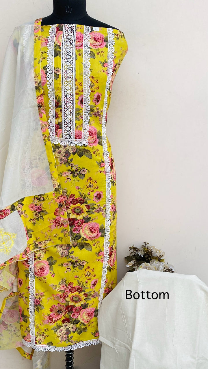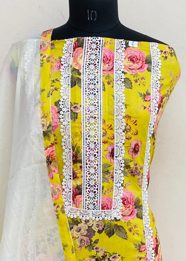 Designer Embroidered Suit Length 3 Piece Yellow Muslin Cotton With Embroidered Mal Cotton Dupatta & Cream Colour Cotton Bottom