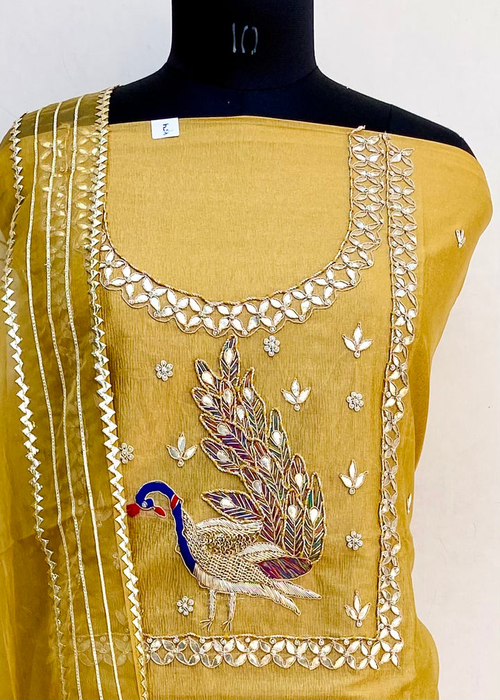 Designer Embroidered Suit Length 3 Piece Yellow Tissue With Pearl & Gotta Patti Work
