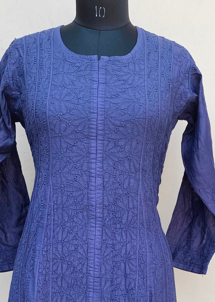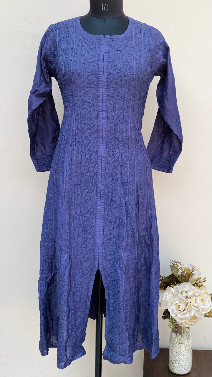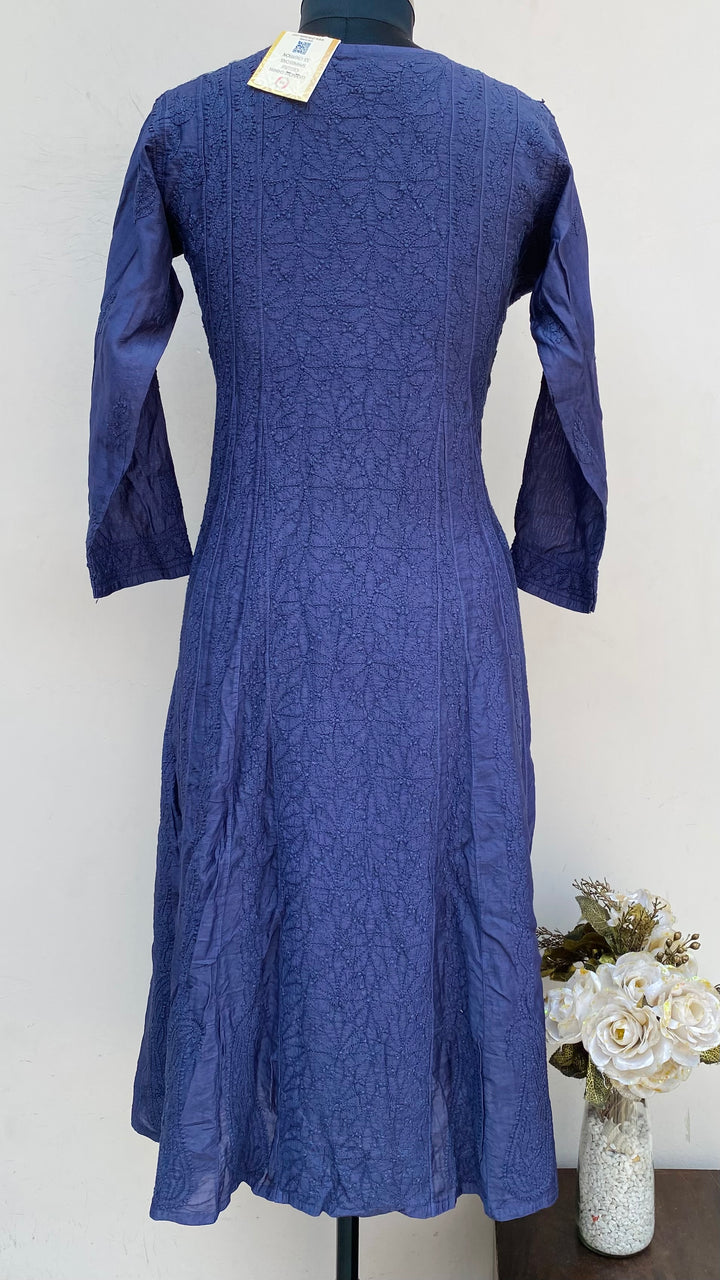 Lucknowi Chikankari Anarkali Kurti Navy Blue Mal Chanderi With Self Work