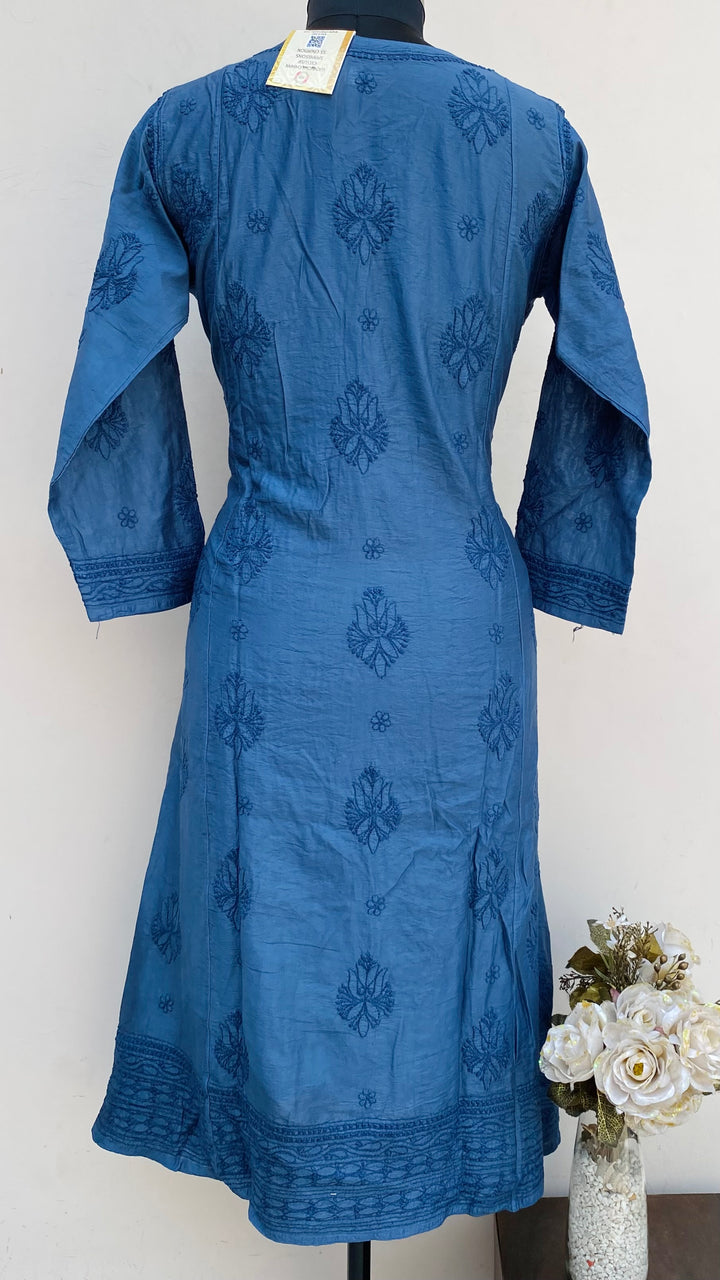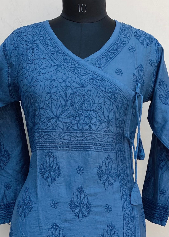 Lucknowi Chikankari Angrakha Kurti Navy Blue Mal Chanderi With Self Work