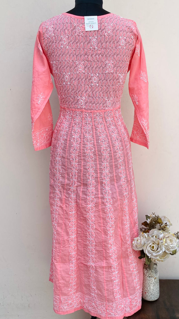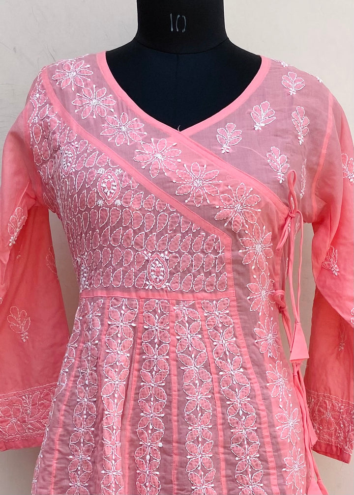 Lucknowi Chikankari Angrakha Kurti Pink Cotton