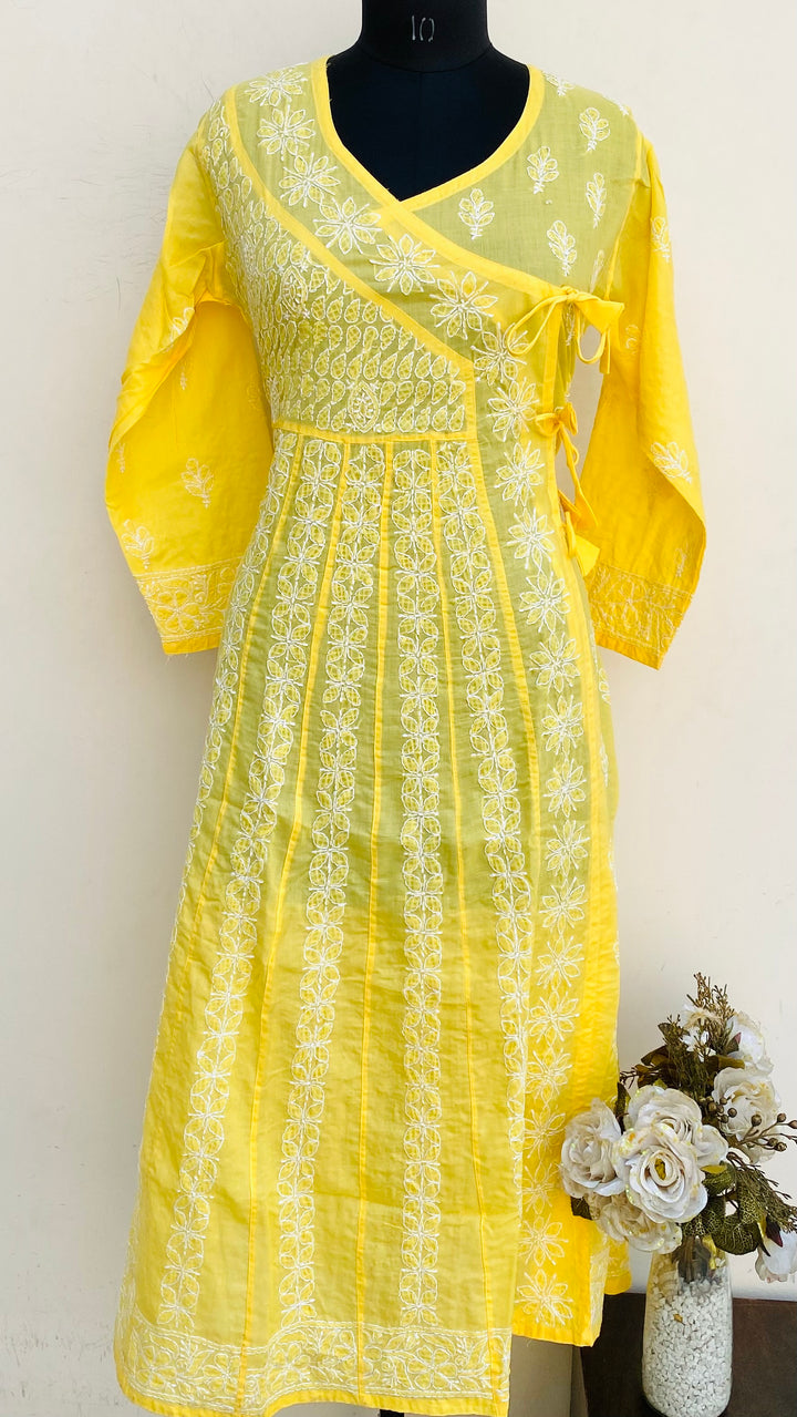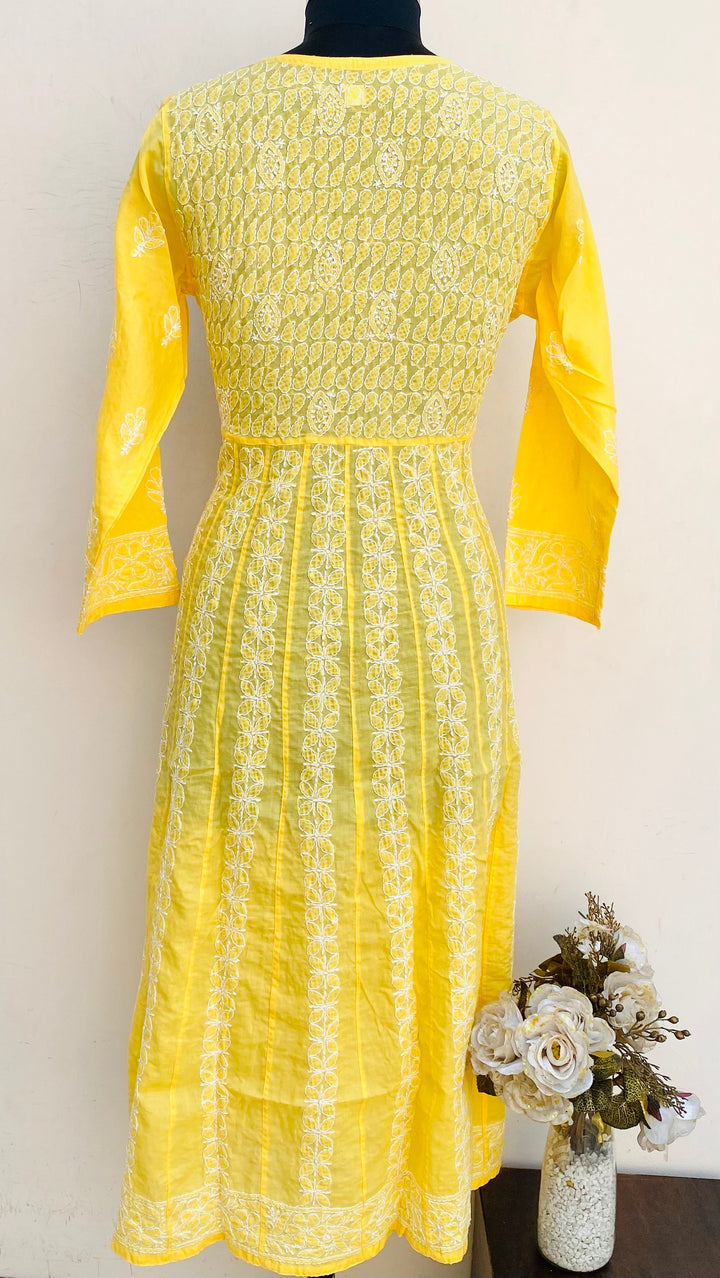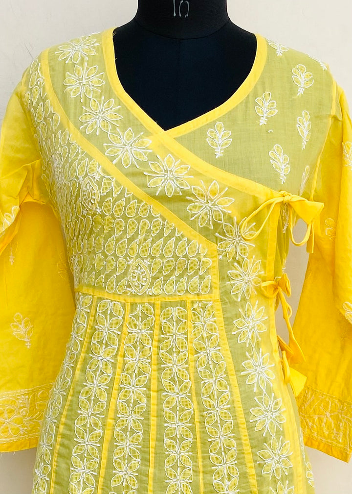 Lucknowi Chikankari Angrakha Kurti Yellow Cotton