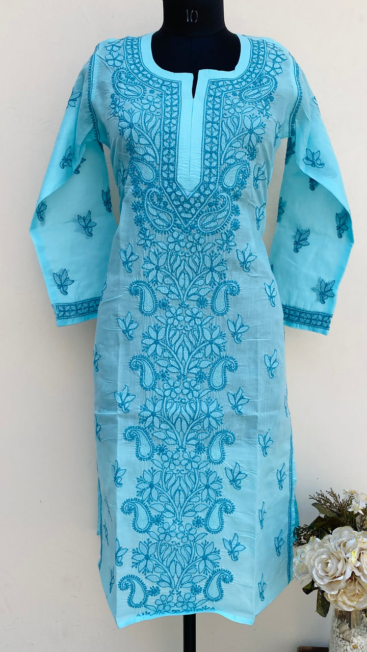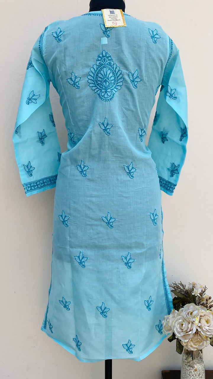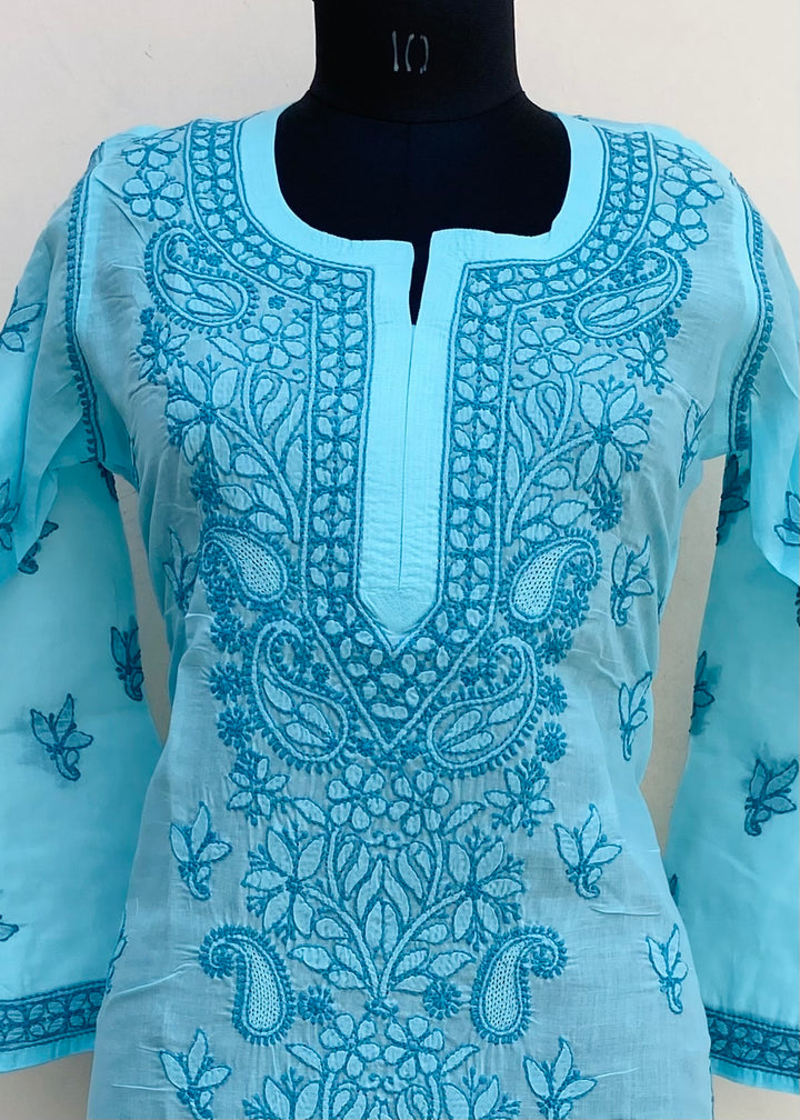 Lucknowi Chikankari Kurti Blue Cotton With Jaali Work