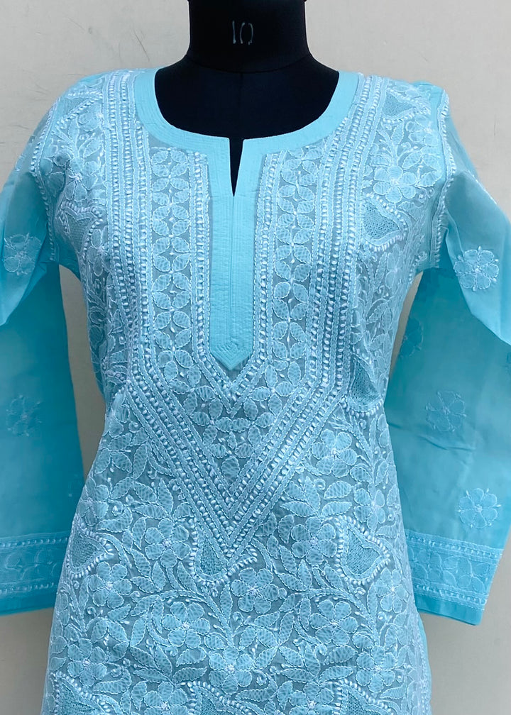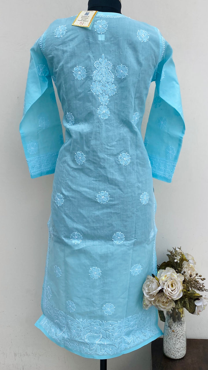 Lucknowi Chikankari Kurti Blue Cotton With Jaali Work