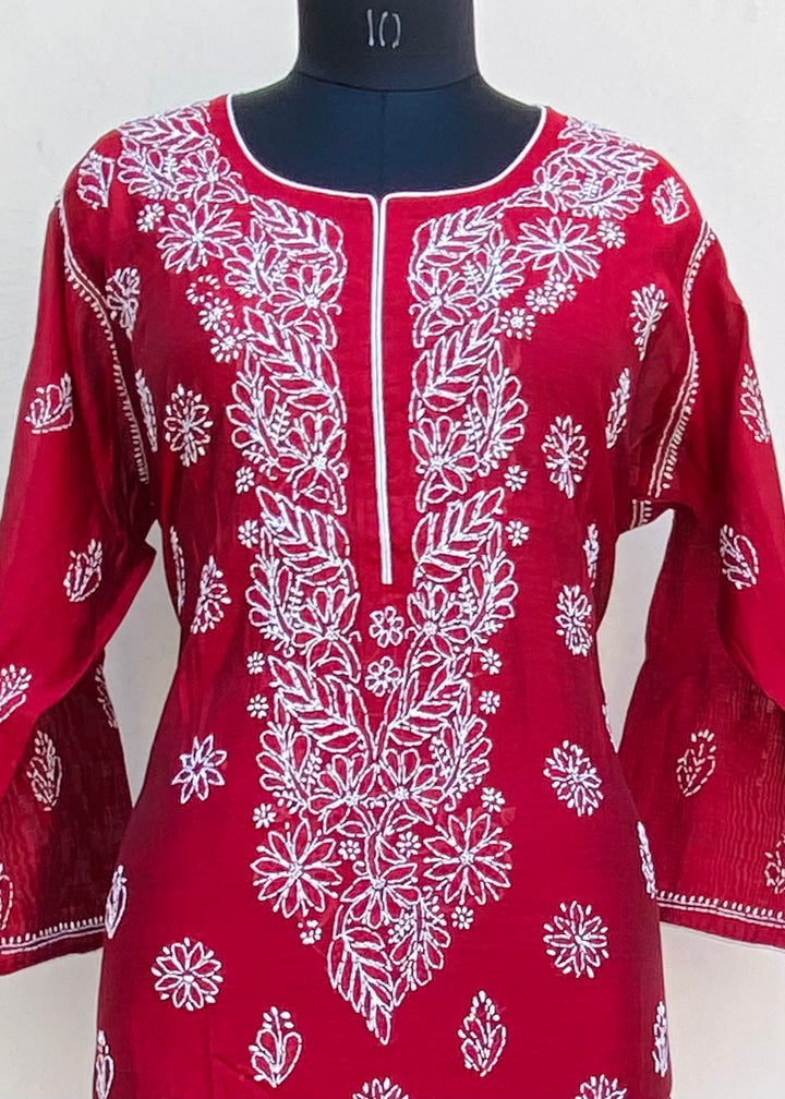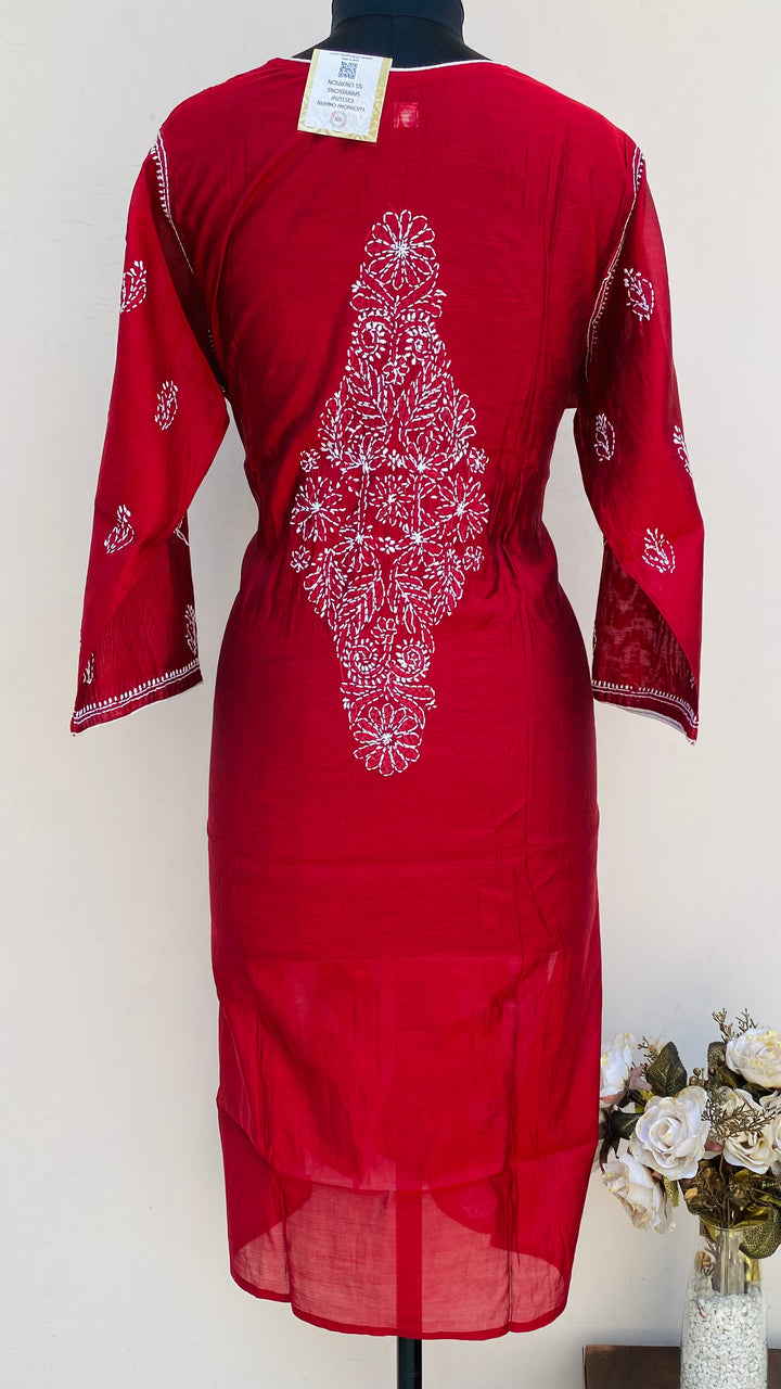 Lucknowi Chikankari Kurti Maroon Mal Chanderi