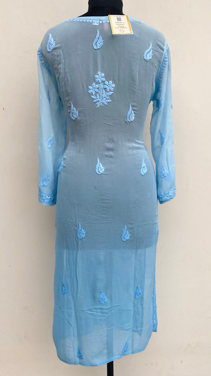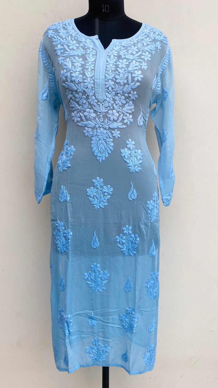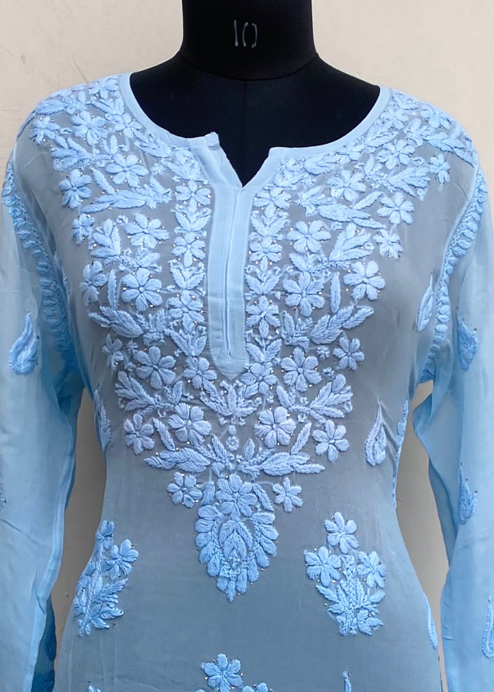 Lucknowi Chikankari Kurti Powder Blue Pure Georgette With Self 3D & Mukaish Work