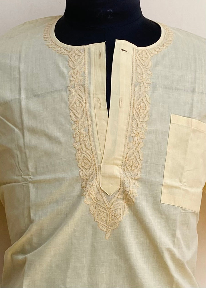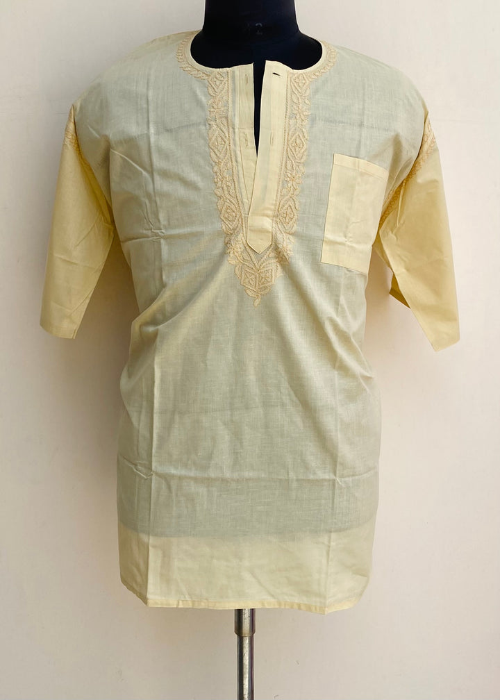 Lucknowi Chikankari Men’s Half Sleeves Short Kurta Beige Cotton With Pocket