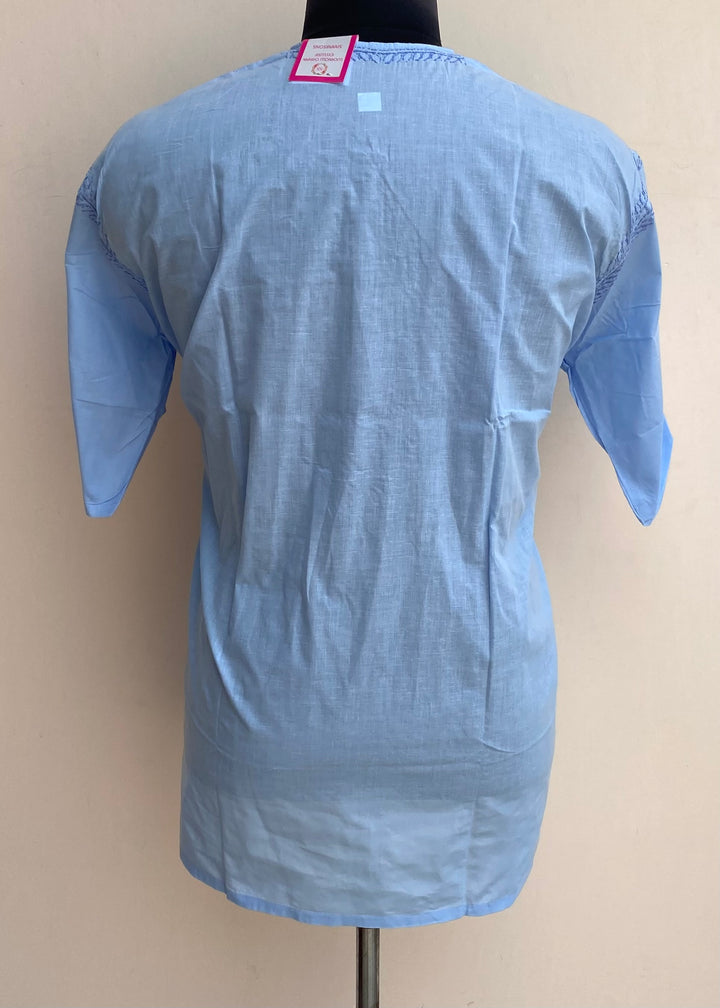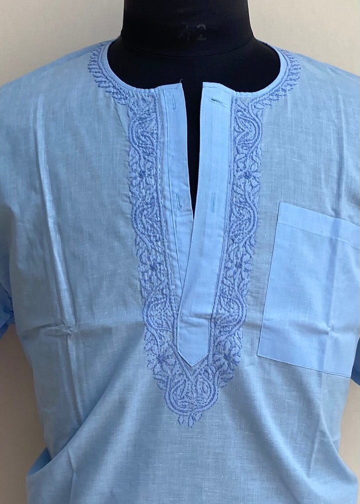 Lucknowi Chikankari Men’s Half Sleeves Short Kurta Blue Cotton With Pocket