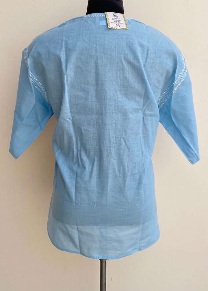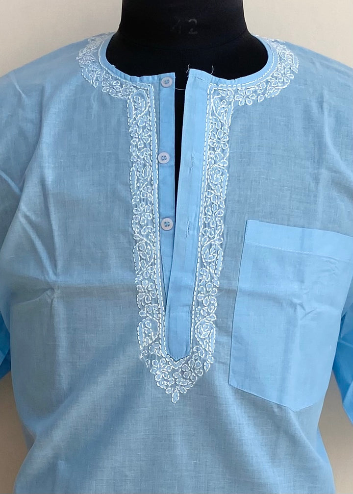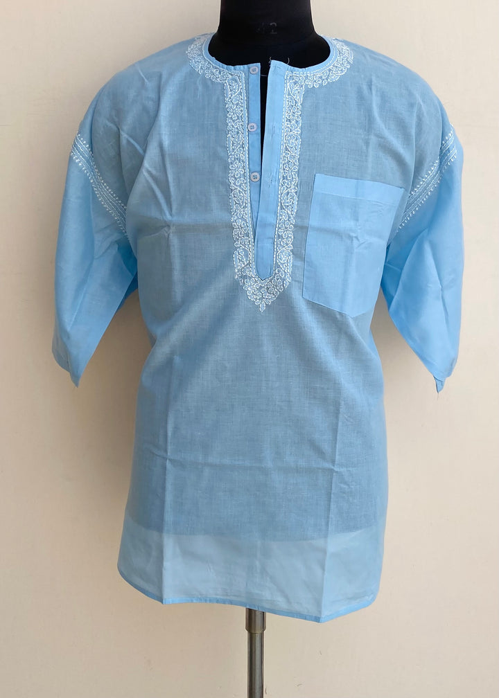 Lucknowi Chikankari Men’s Half Sleeves Short Kurta Blue Cotton With Pocket